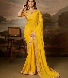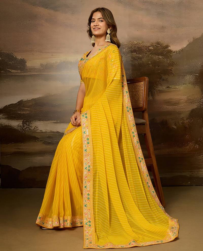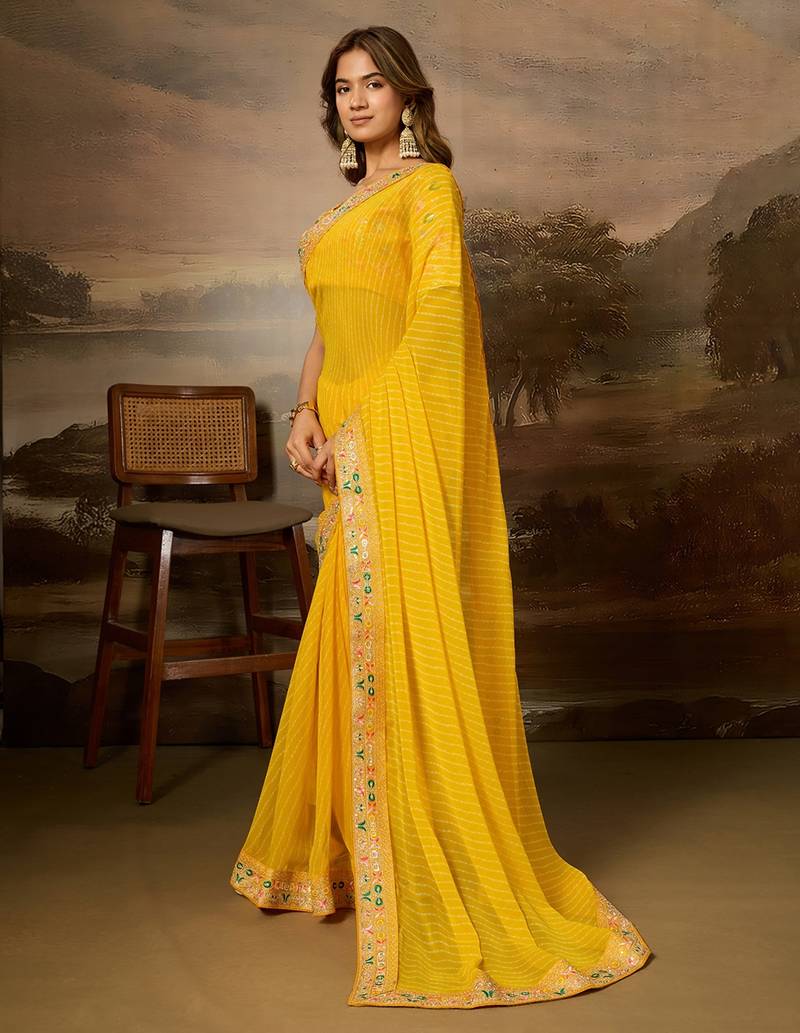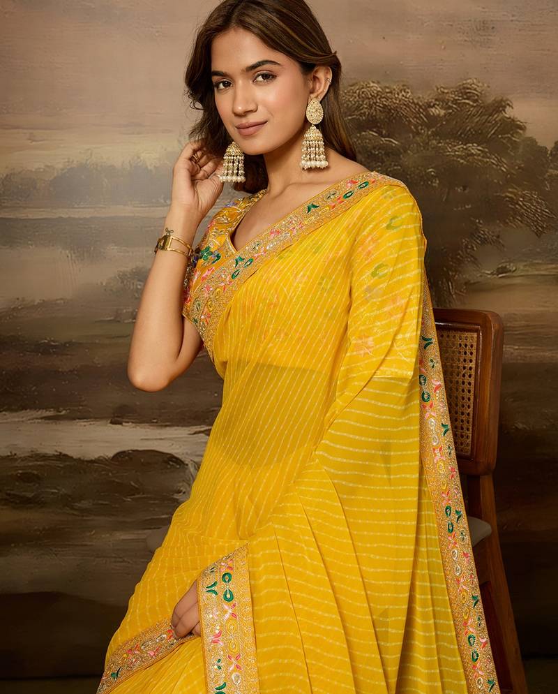 Yellow embroidered leheriya georgette saree with designer border