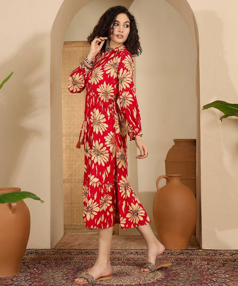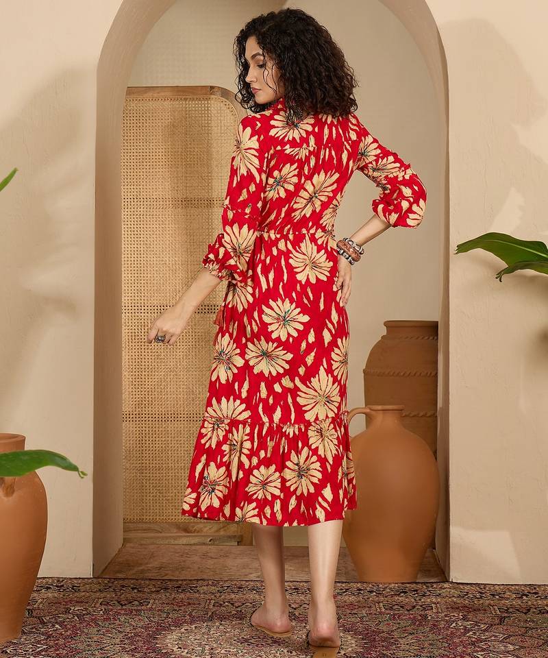 | Product Description | Radiate Confidence In This Striking Crimson Midi Dress, A Perfect Fusion Of Bold Color And Timeless Floral Charm. This Silhouette Is Designed To Offer A Vibrant Yet Sophisticated Look, Making It An Ideal Choice For Daytime Events, Office To Evening Transitions, Or Weekend Brunches. |