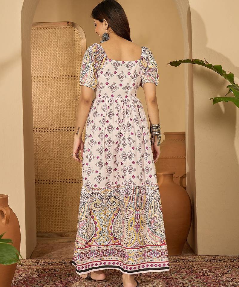 | Product Description | Exude A Sense Of Refined Bohemian Grace With This Puff Sleeve Paisley Tiered Maxi Dress. This Piece Beautifully Blends Traditional Motifs With A Feminine, Modern Silhouette, Making It An Ideal Choice For Cultural Celebrations, Brunch Outings, Or Elevated Everyday Wear. |