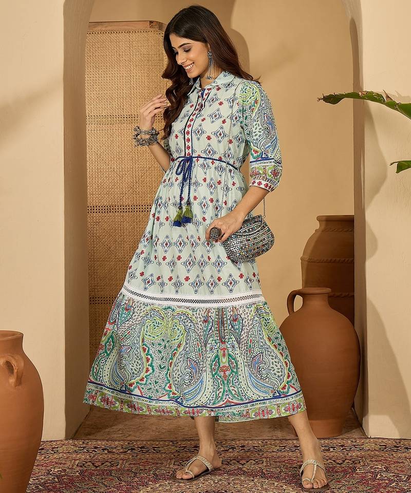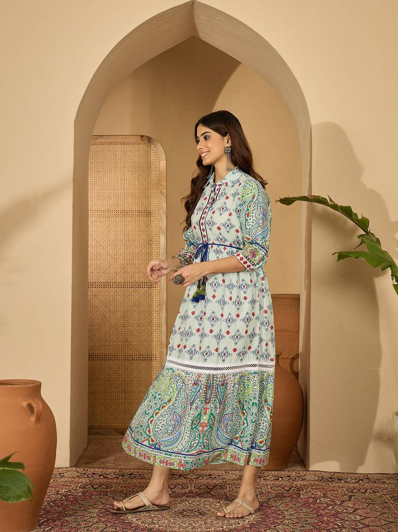 | Product Description | Capture A Sense Of Cool, Effortless Charm In This Arctic Blue Paisley Maxi Dress. This Piece Combines The Structure Of A Classic Shirtdress With The Fluid Movement Of A Tiered Maxi, Making It An Essential For Coastal Vacations, Garden Soirees, Or Vibrant Weekend Brunches. |
