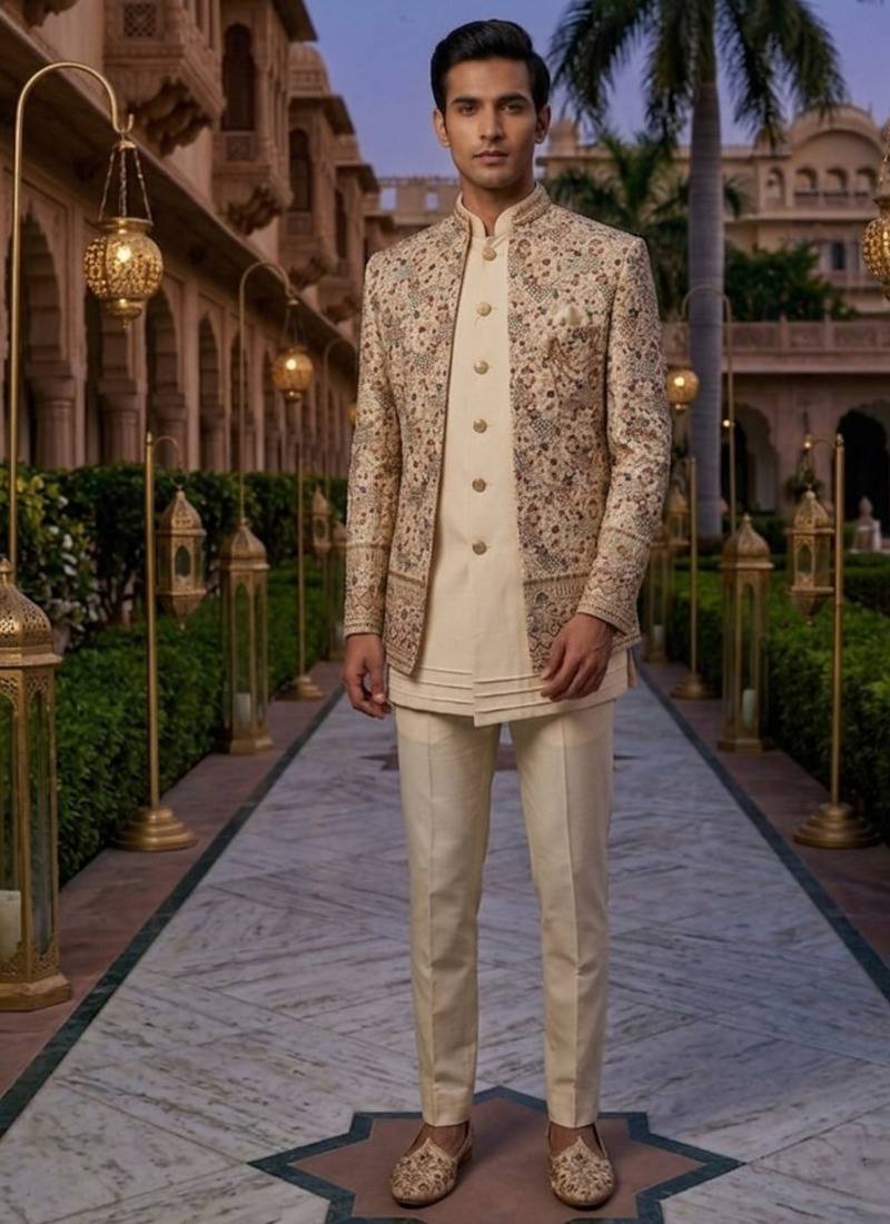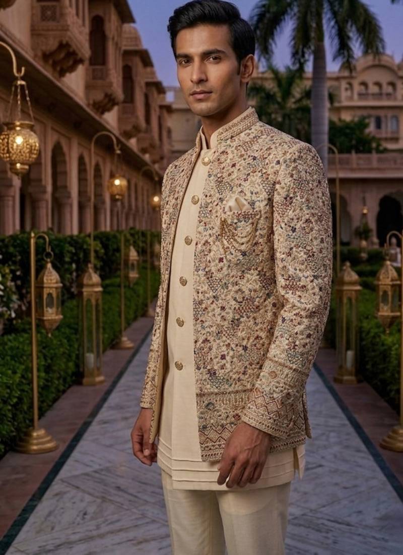 Cream thread and sequins embroidered short indowestern