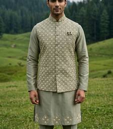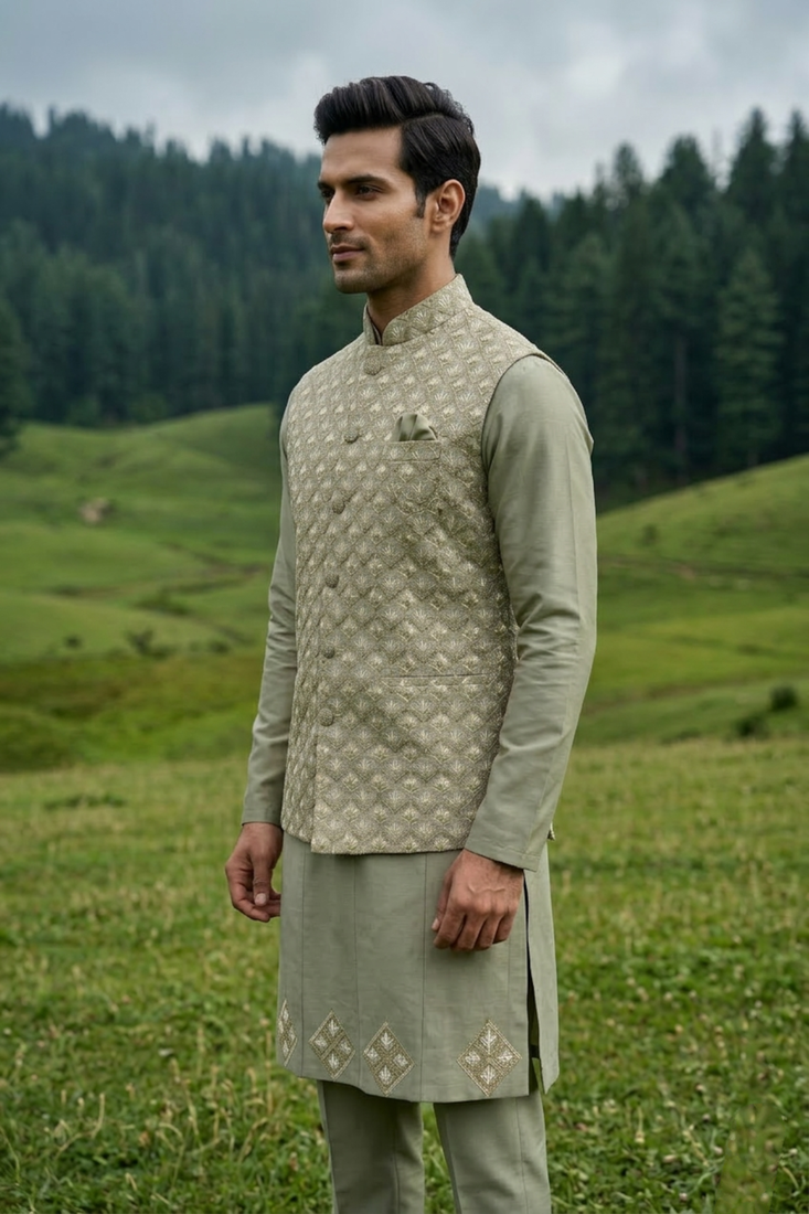 Green silk mens kurta jacket set with thread sequins