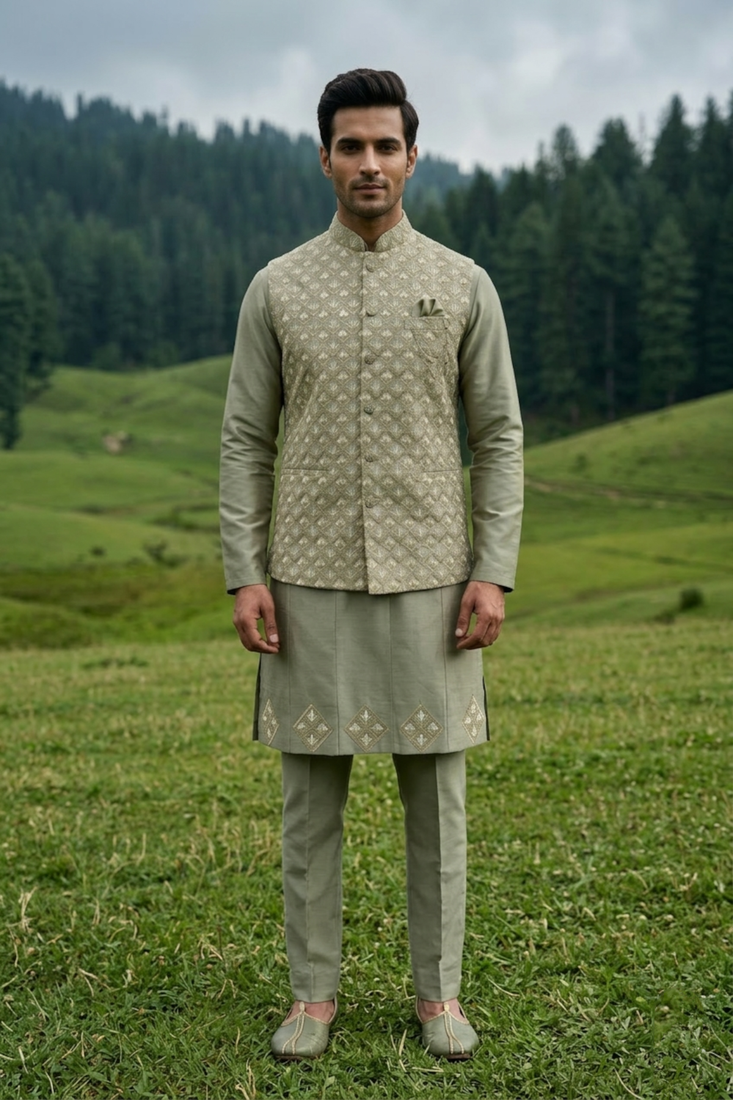 | Product Name | Green Silk Mens Kurta Jacket Set With Thread Sequins | |