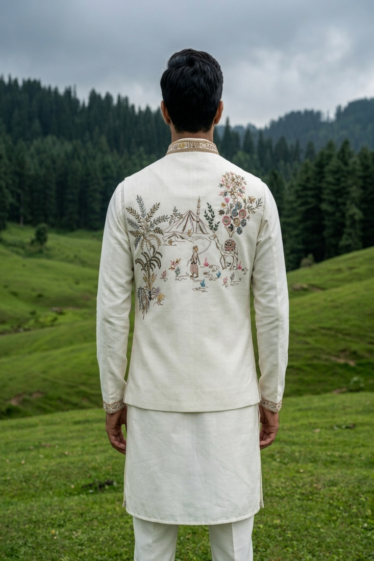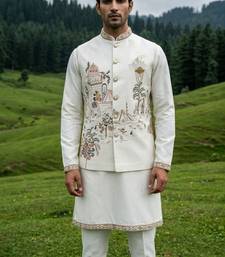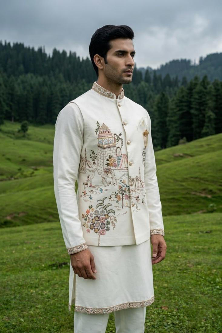 | Product Description | This Ivory Waistcoat Kurta Set Is Designed As A Stitched 3 Pc Set Featuring Thread And Sequins Embroidery. Crafted From Silk Blend Fabric, The Outfit Offers A Smooth Texture And Structured Finish. The Set Includes A Jacket, Kurta, And Trouser, Creating A Coordinated And Layered Look. The Embroidery Adds Detailed Surface Design While Maintaining A Balanced Appearance. It Also Includes 1 Brooch And 1 Pocket Square As Accessories. Suitable For Festive Occasions, This Kurta Set Reflects A Structured And Traditional Outfit Style. |