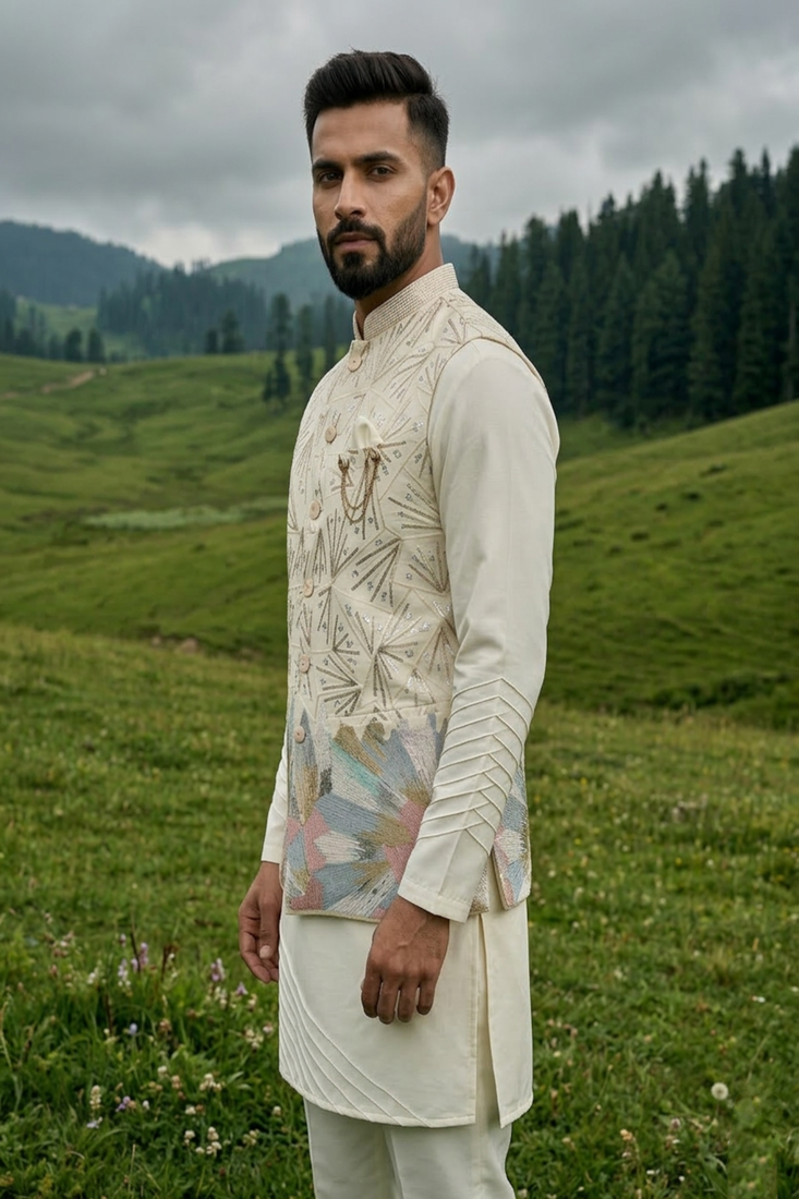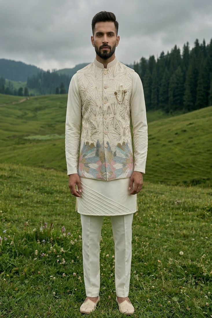 | Product Name | Ivory Silk Mens Kurta Jacket Set With Embroidery | |