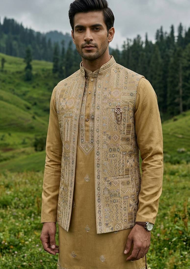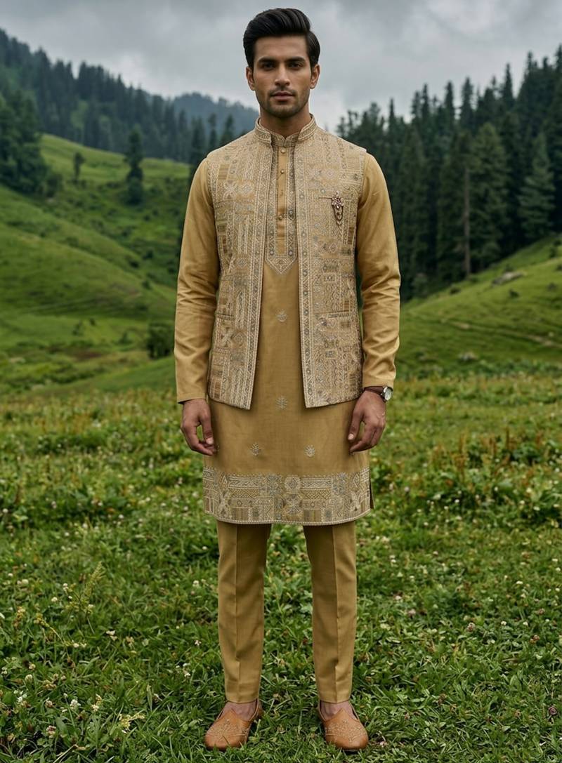 | Product Description | Designed In Mustard, This 3 Pieces Waistcoat Kurta Set Features Thread And Sequins Embroidered Detailing. The Set Includes A Kurta And Waistcoat, Forming A Complete Outfit With A Balanced Structure. Made Using Premium Silk Fabric, It Maintains A Smooth And Defined Finish. The Intricate Embroidery Adds Texture And Visual Depth To The Design. This Kurta Set Is Suitable For Festive Occasions And Traditional Events. |