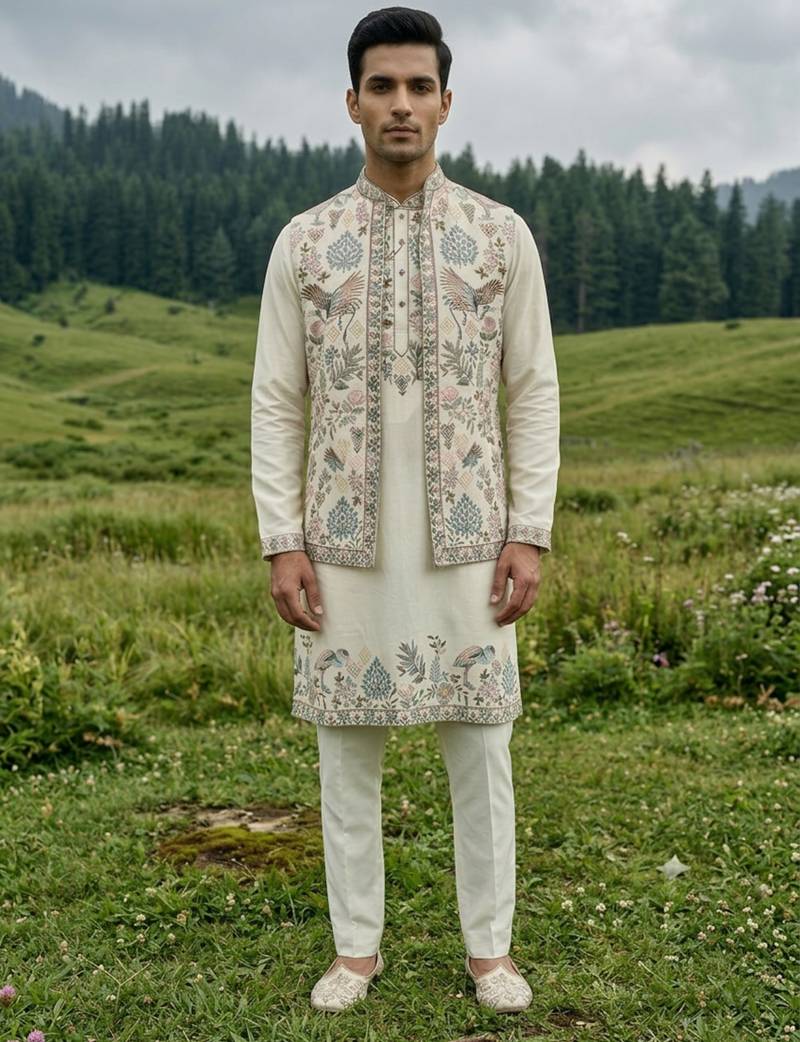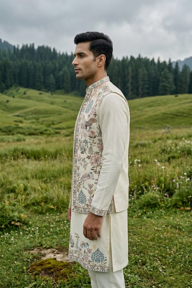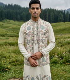 | Product Description | Designed In Off White, This 3 Pieces Waistcoat Kurta Set Features Thread And Sequins Embroidered Detailing. The Set Includes A Kurta And Waistcoat, Forming A Complete Outfit With A Balanced Structure. Made Using Premium Silk Fabric, It Maintains A Smooth And Defined Finish. The Intricate Embroidery Adds Texture And Visual Depth To The Design. This Kurta Set Is Suitable For Festive Occasions And Traditional Events. |