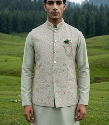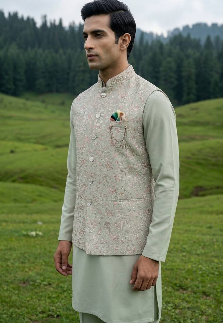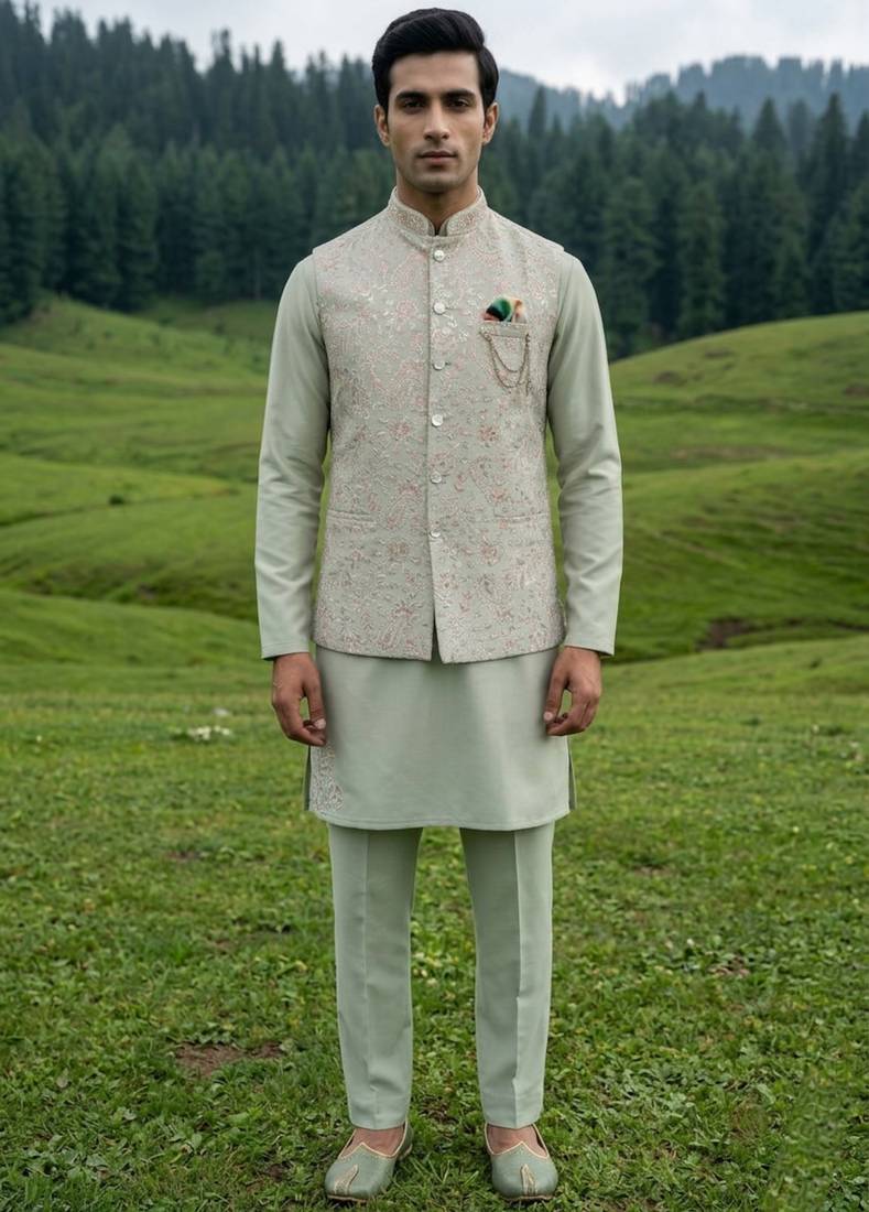| Product Name | Pista Green Silk Mens Jacket Kurta Set With Thread Sequins | |