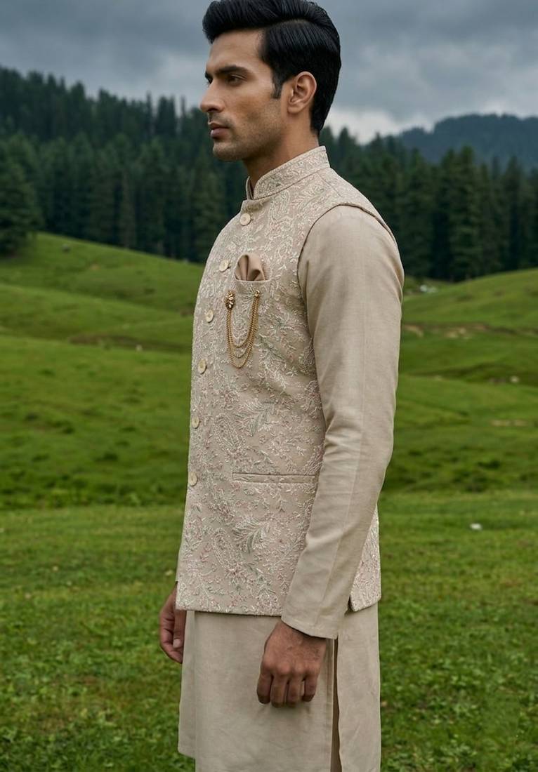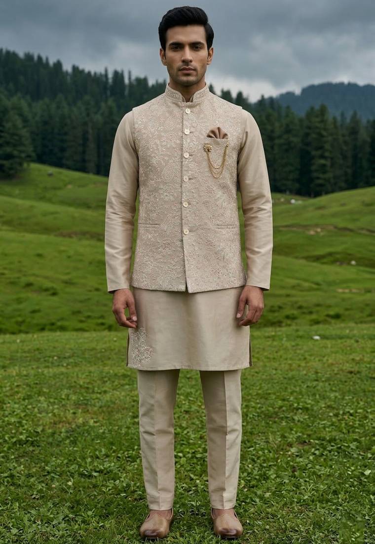| Product Name | Gold Silk Mens Kurta Jacket Set With Thread Sequins | |