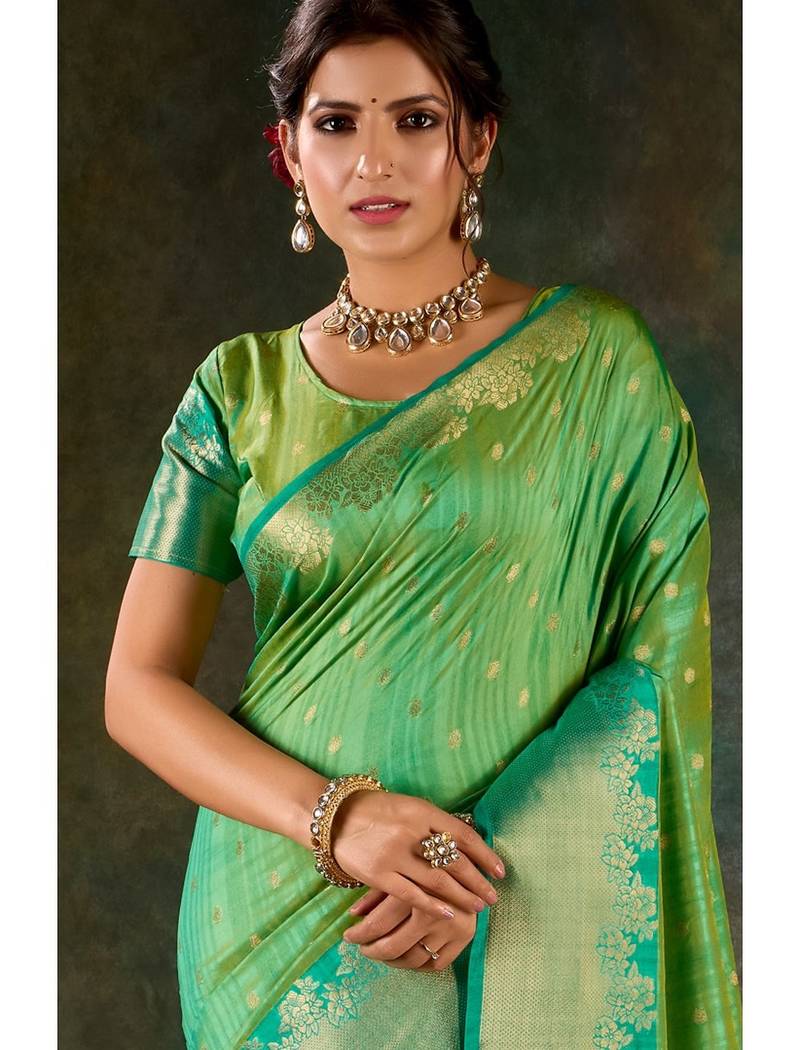 | Product Description | This Refreshing R 1010 Saree Combines A Mint Green Base With A Deep Emerald Green Border And Pallu, Featuring Subtle Gold Zari Buttis Throughout The Body And A Wide, Intricately Woven Floral Border, Finished With A Matching Green Blouse. |
