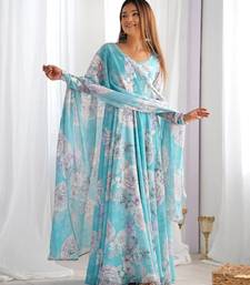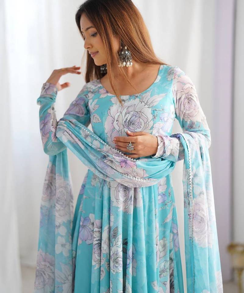 Women faux georgette printed fully flair anrkali ,pant with dupatta stitched