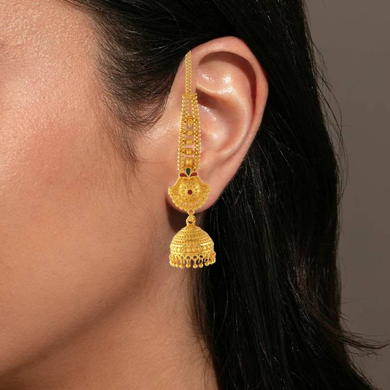 | Product Description | Elevate Your Ethnic Look With These Exquisite Handmade Kan Chain Earwire Jhumkis, Crafted From Pure Brass And Finished With Premium Micron Gold Plating For A Real Gold Like Shine. Inspired By Timeless Indian Heritage, These Long Dangler Umbrella Style Earrings Feature A Secure Wire Lock That Goes Behind The Ear For Added Comfort And Safety. The Intricate Meenakari Detailing Adds Vibrant Charm And Grace, Making Them The Perfect Accessory For Weddings, Bridal Wear, Festive Celebrations, And Formal Occasions. Designed With Skin Safe, Anti Allergy Brass, These Earrings Combine Traditional Artistry With Modern Wearability, Ensuring Elegance Without Compromise. |