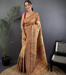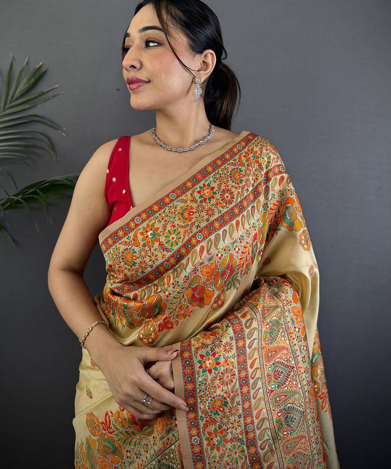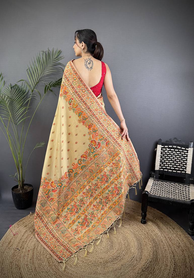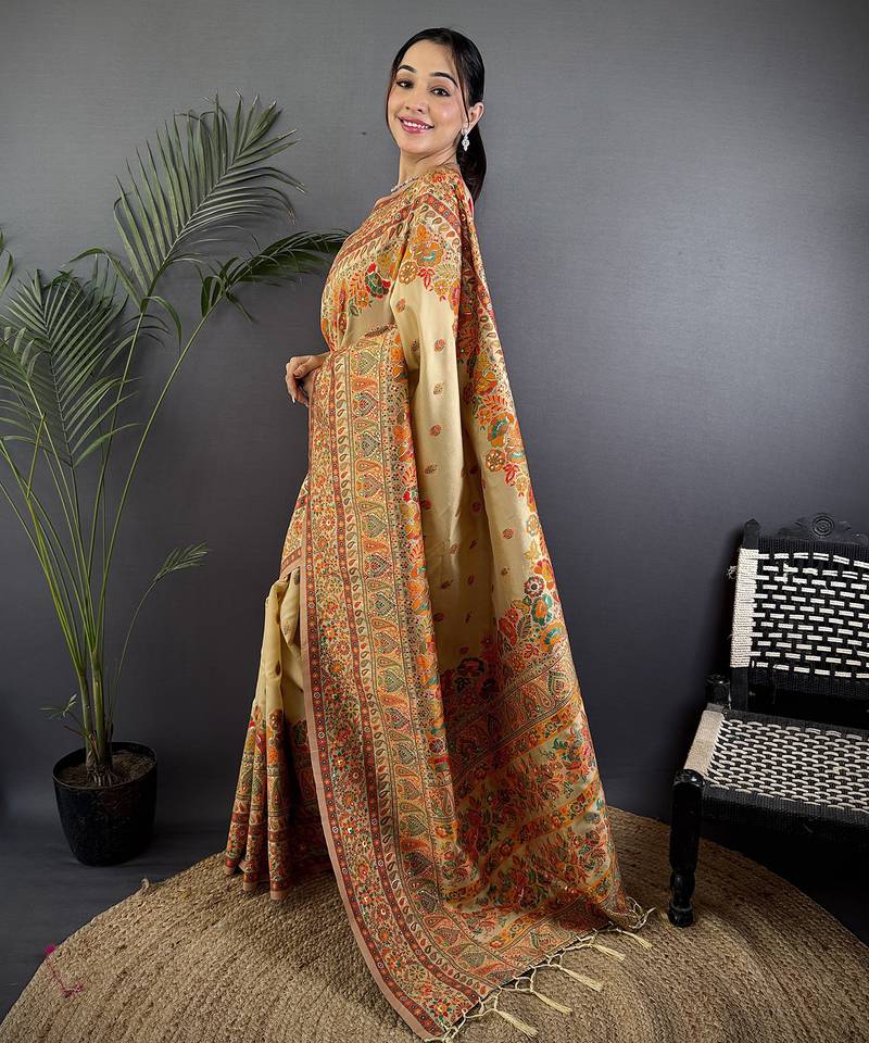 Beige pashmina silk meenakari weaving madhubani design kashmiri saree