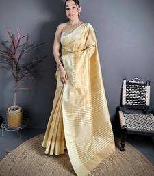 Beige raw silk saree with khadi weaving pallu & zari weaving border