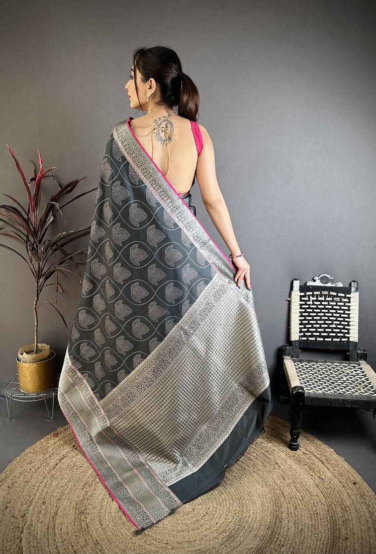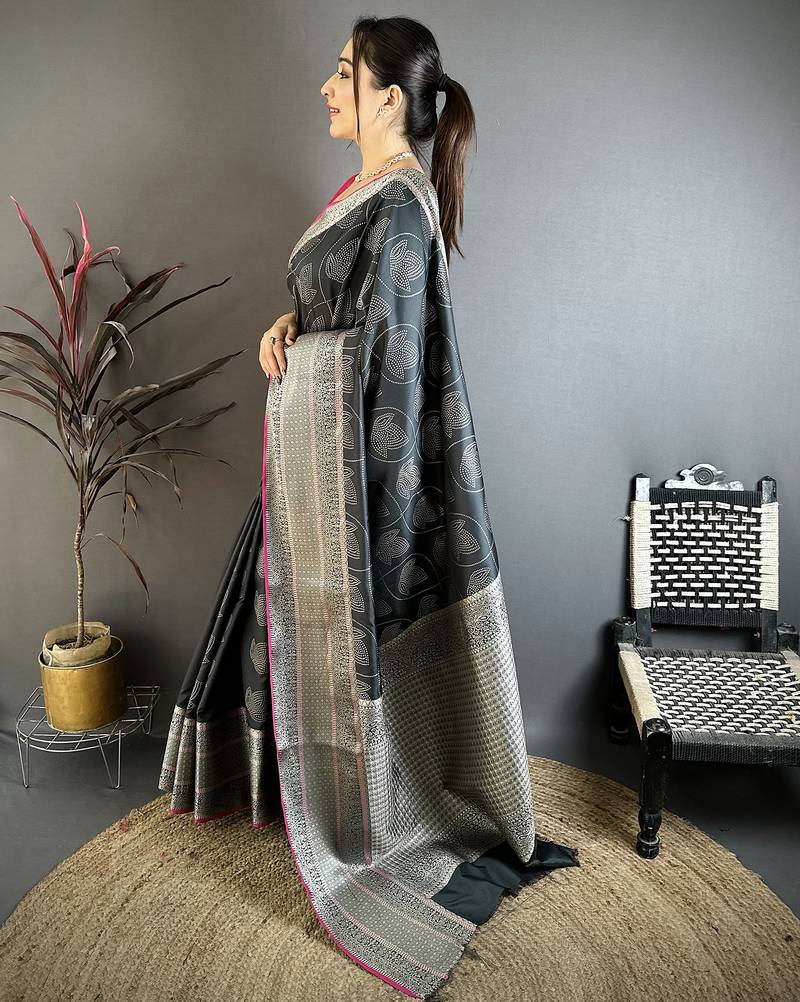 | Product Description | This Black Banarasi Silk Leaf Motif Kanjivaram Saree Offers A Bold And Modern Look For Any Woman. The Deep Grey Color Stands Out And Looks Very Smart. It Is A Great Choice For Evening Parties. The Leaf Motif Pattern Gives This Silk Saree A Natural And Fresh Feel. The Fabric Is Smooth And High Quality, Making It Easy To Pleat. You Can Wear It For Many Hours Without Feeling Any Discomfort. This Beautiful Saree Is A Perfect Gift For Someone Special Or For Yourself. It Matches Well With Silver Or Diamond Jewelry. Upgrade Your Ethnic Style With This Elegant And Durable Silk Outfit Today. |