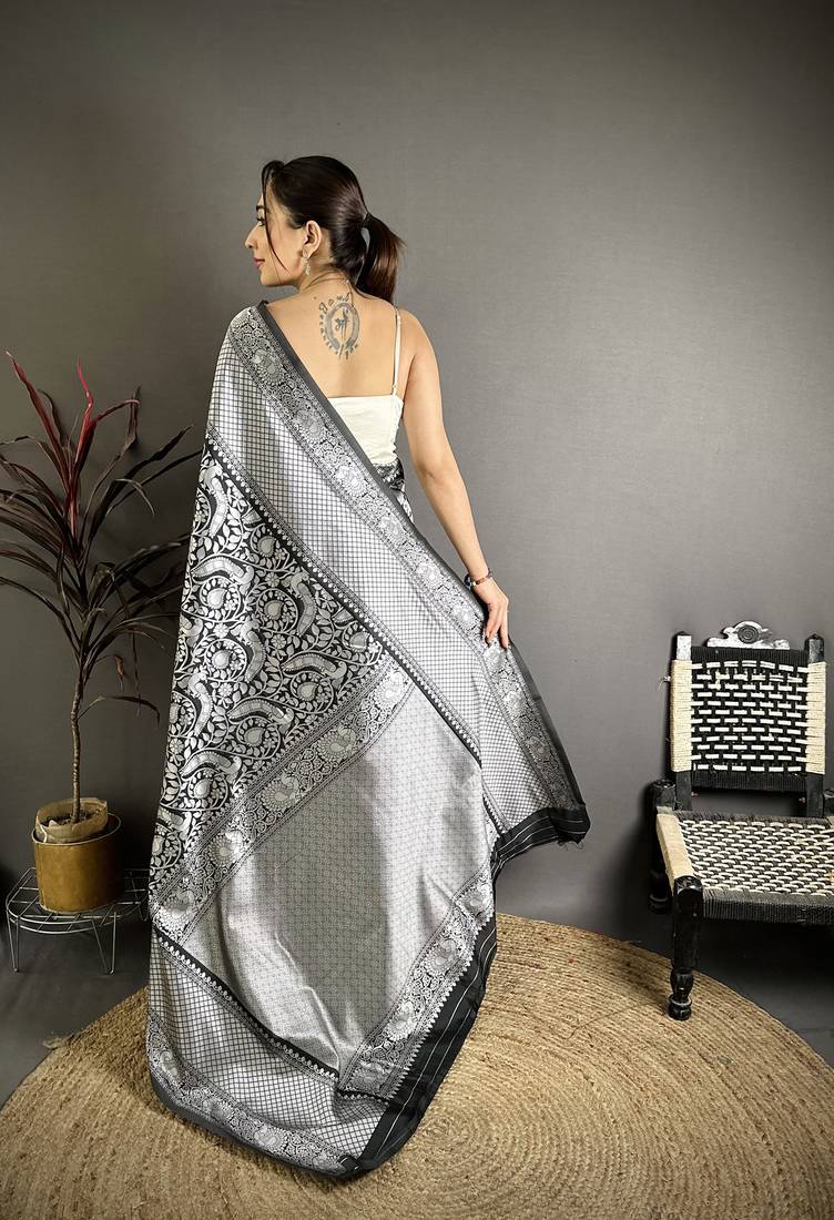 Black soft silk floral motifs kanjivaram silver weaving saree