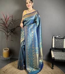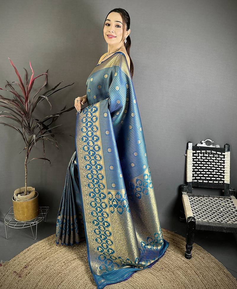 Blue banarasi soft silk checked body with floral motifs south pattu saree