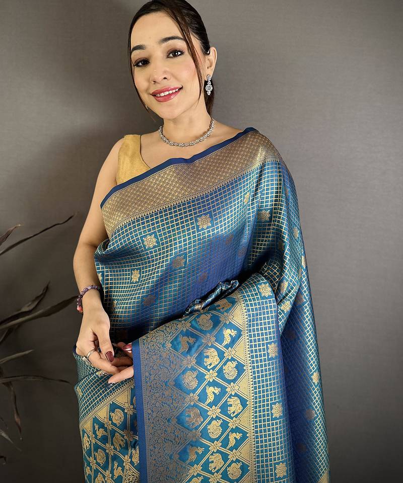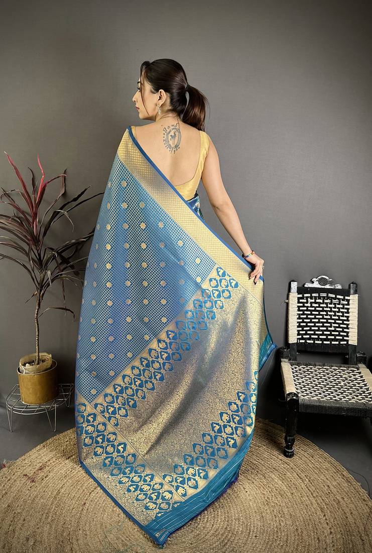 | Product Name | Blue Banarasi Soft Silk Checked Body With Floral Motifs South Pattu Saree | |