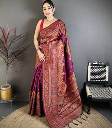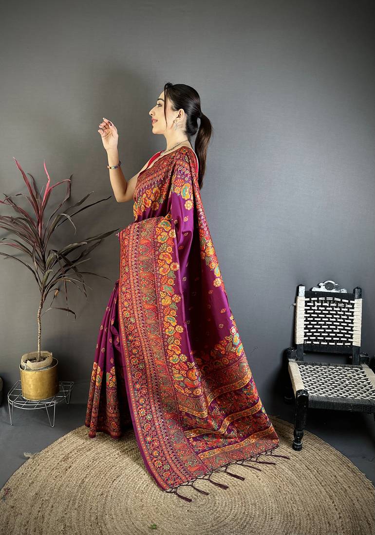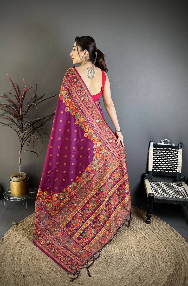 Burgundy pashmina silk meenakari weaving madhubani design kashmiri saree