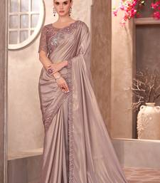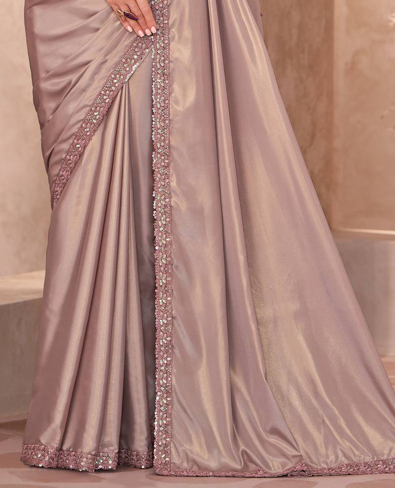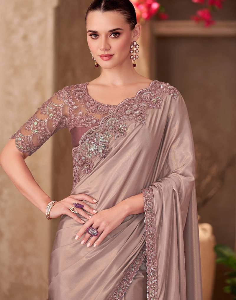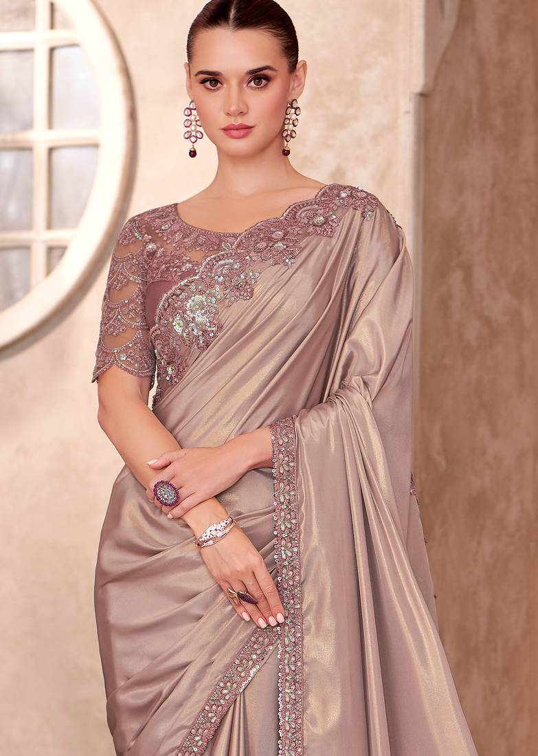 Champagne beige shimmer silk crepe heavy embroidery and sequin work partywear saree