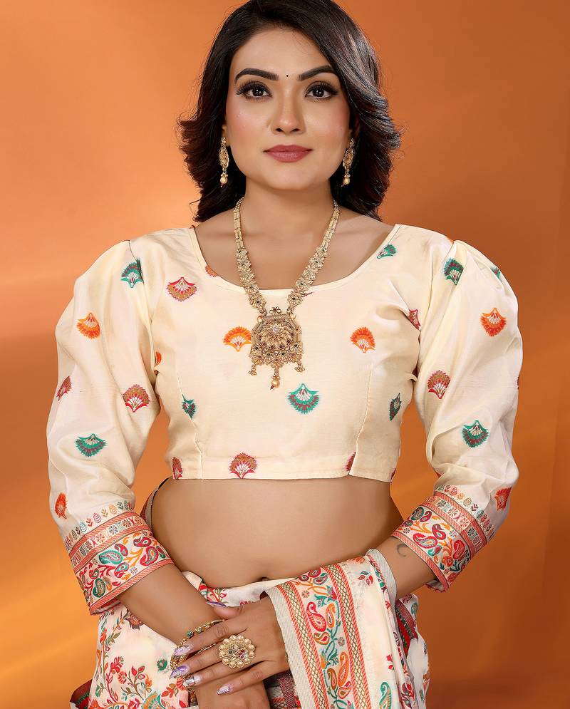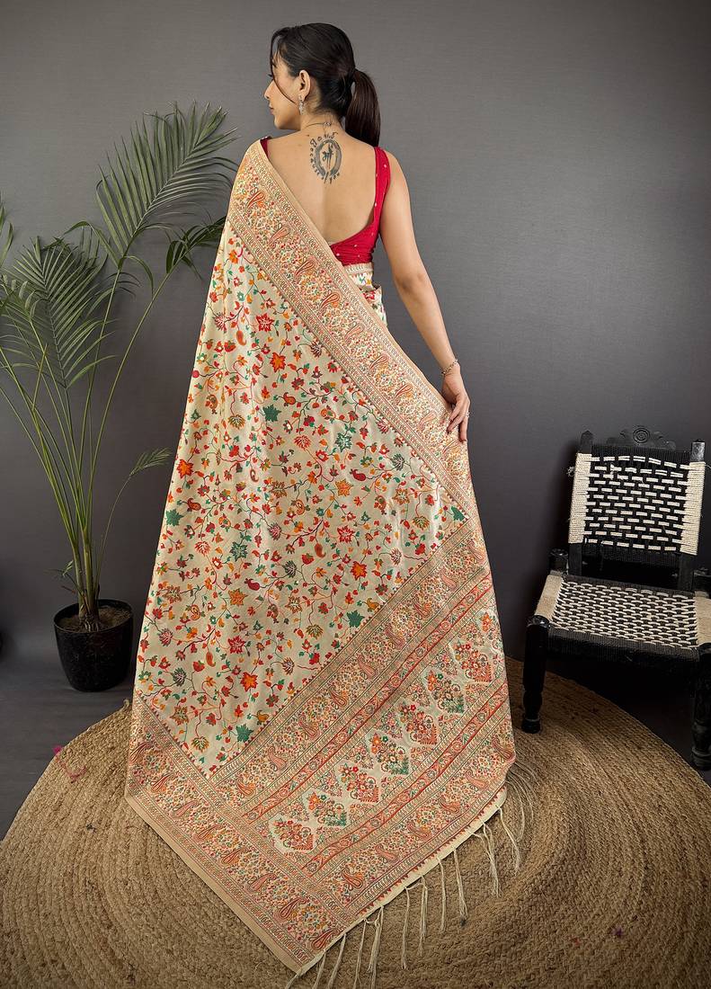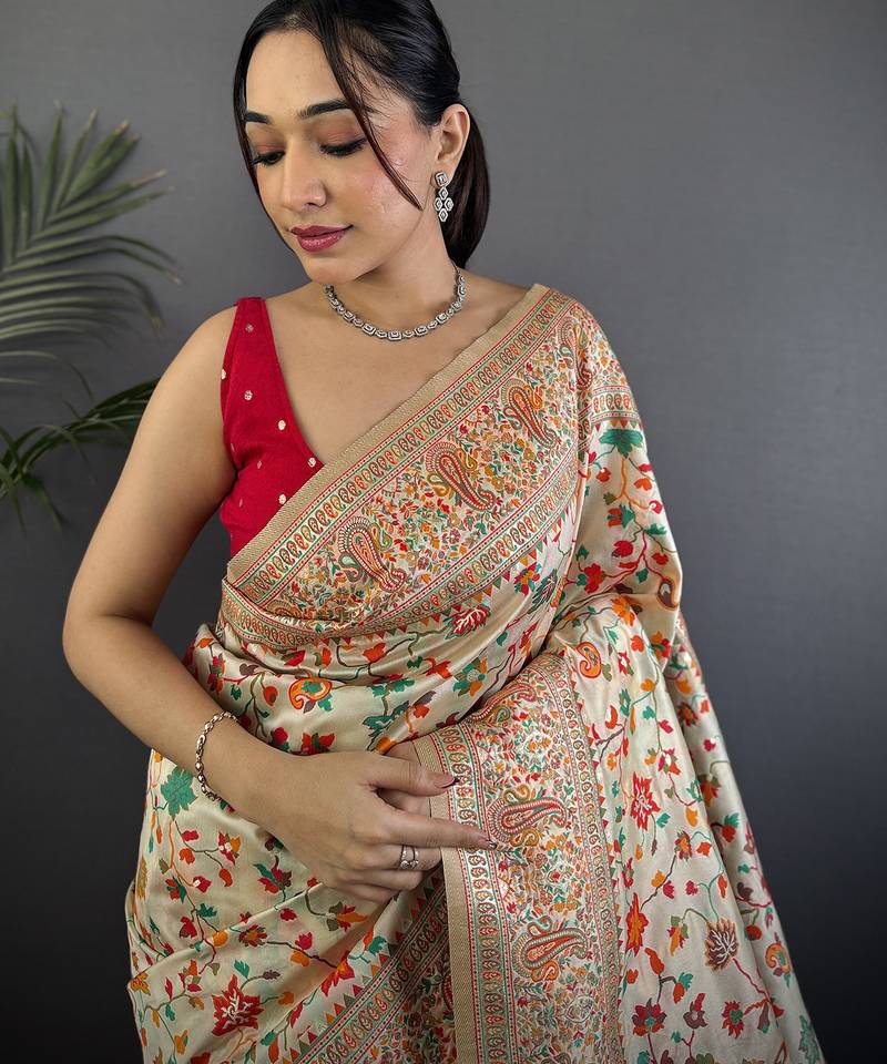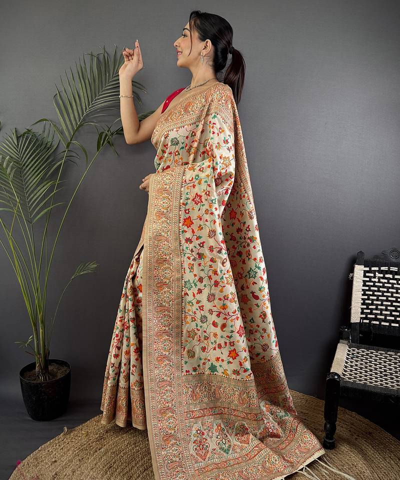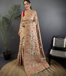 Cream pashmina silk meenakari weaving madhubani design kashmiri saree