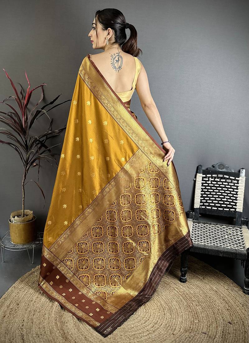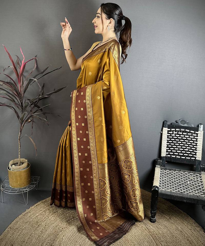 | Product Name | Golden Bronze Soft Silk Small Floral Zari Butti Gold Zari Weaving Banarasi Saree | |