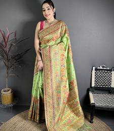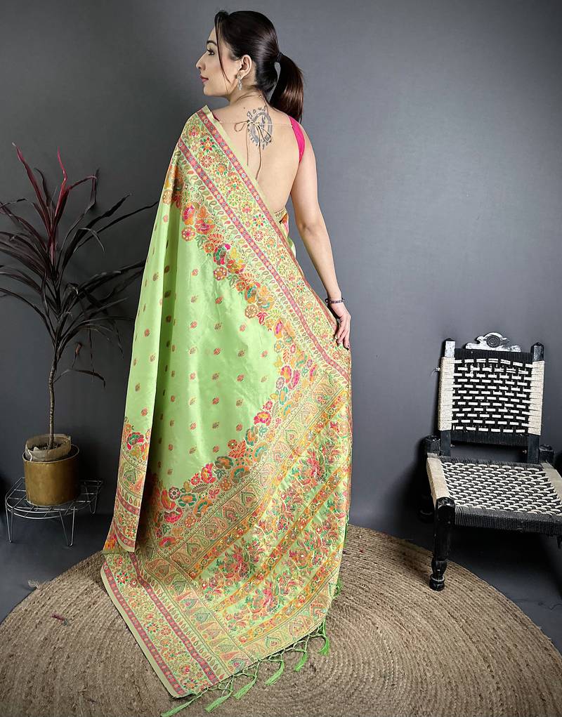 Light green pashmina silk meenakari weaving madhubani design kashmiri saree