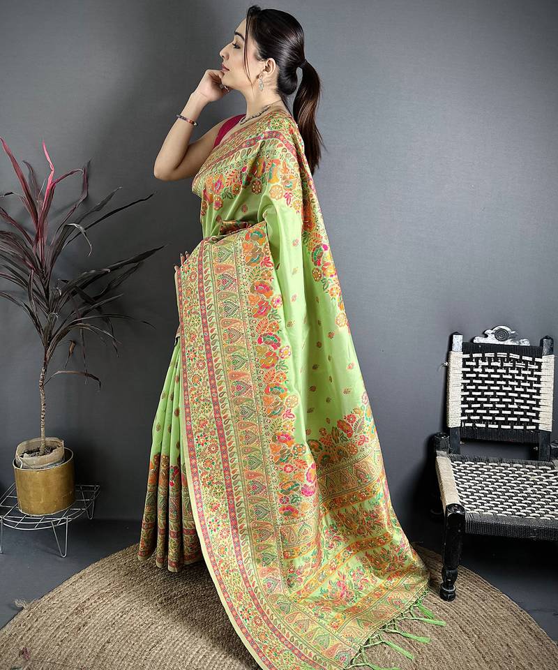 | Product Name | Light Green Pashmina Silk Meenakari Weaving Madhubani Design Kashmiri Saree | |
