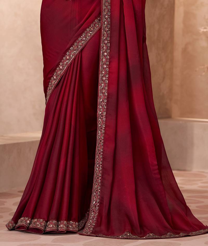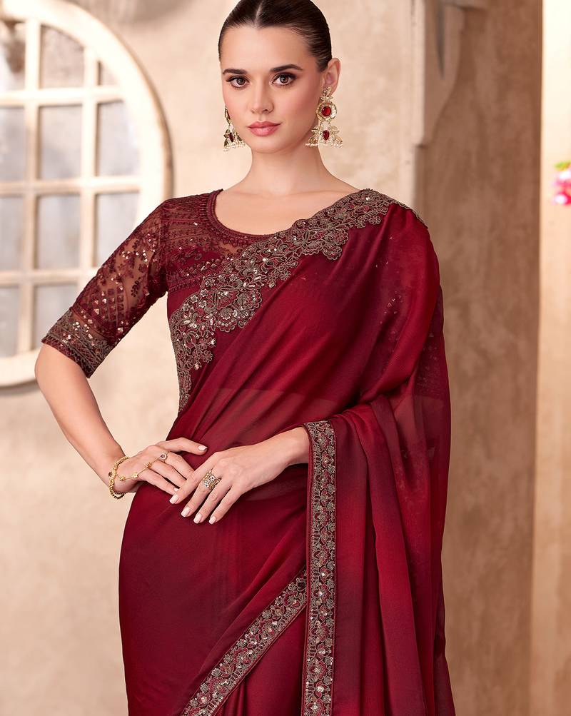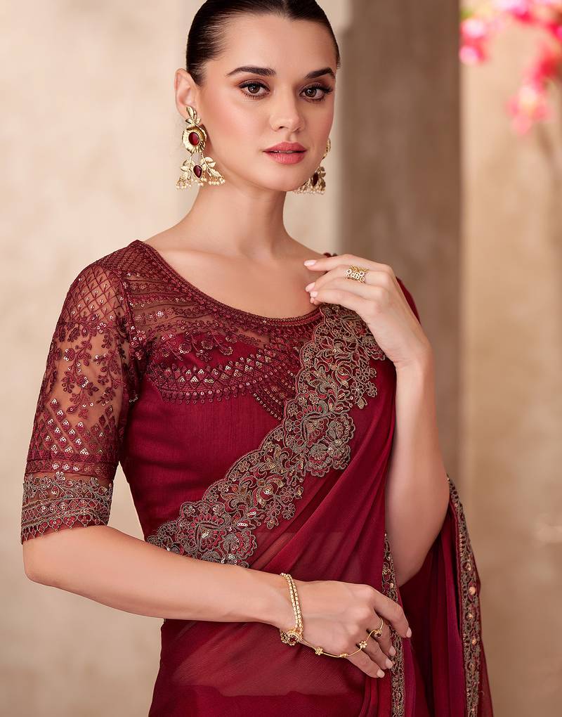 Maroon sparkle shaded chiffon heavy embroidery and sequin work partywear saree