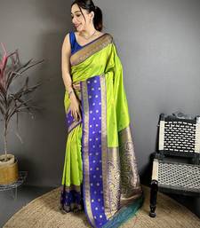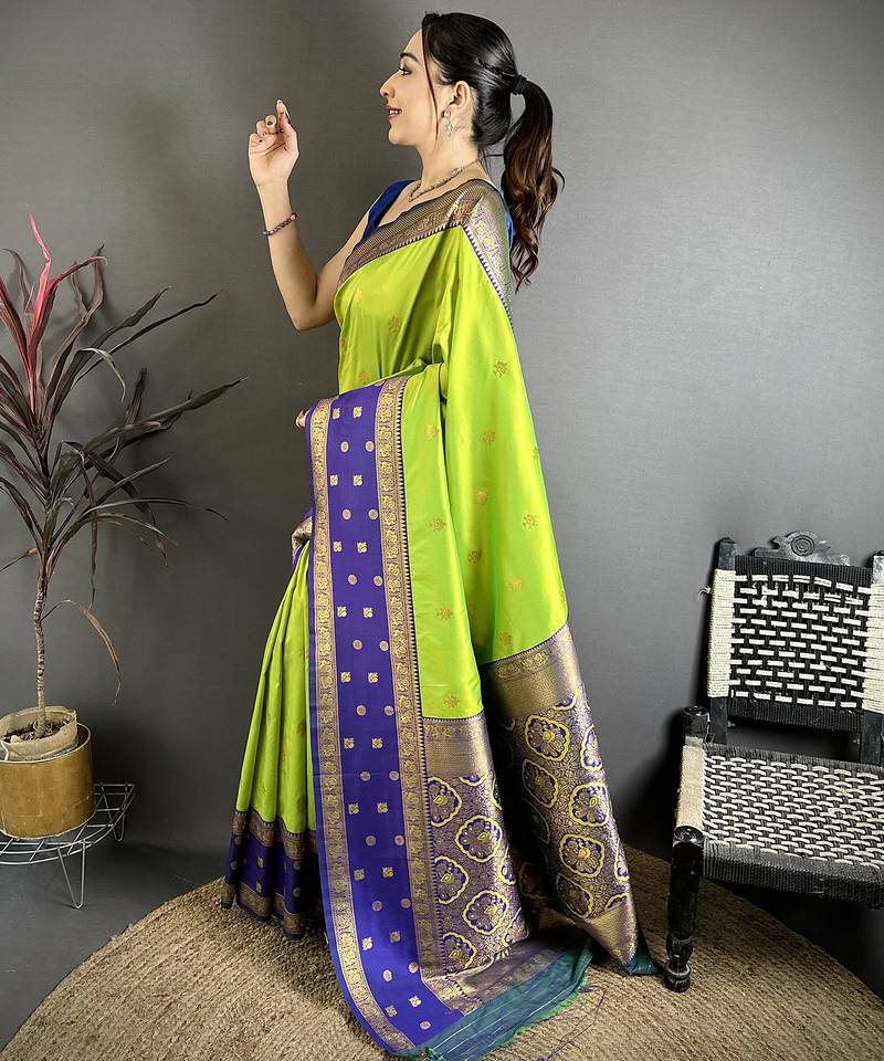 | Product Name | Parrot Green Soft Silk Small Floral Zari Butti Gold Zari Weaving Banarasi Saree | |