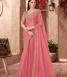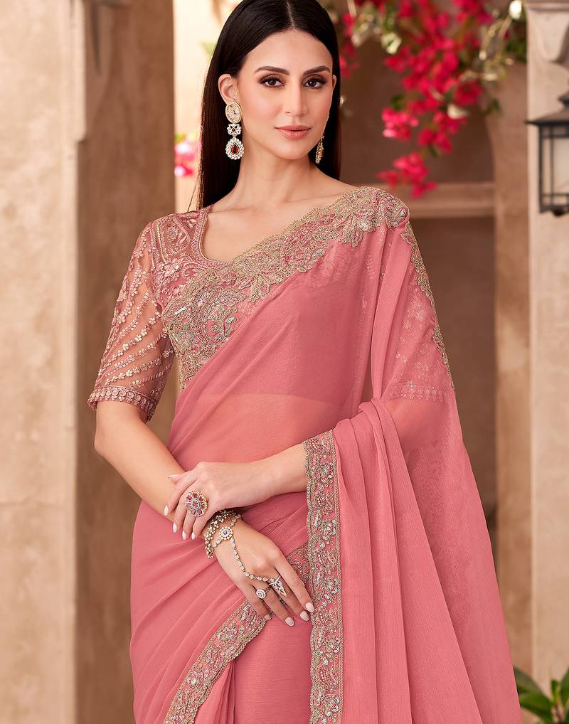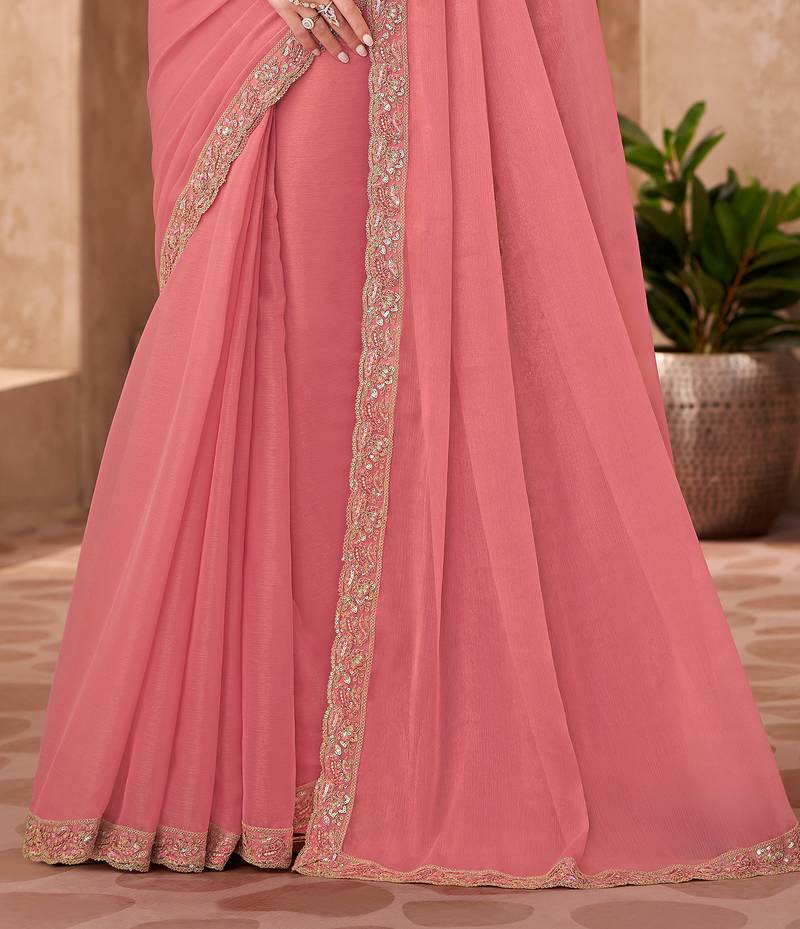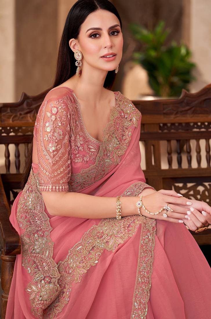 Peach georgette silk heavy embroidery and sequin work partywear saree