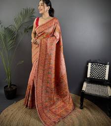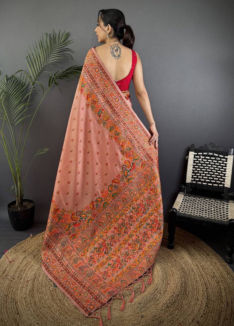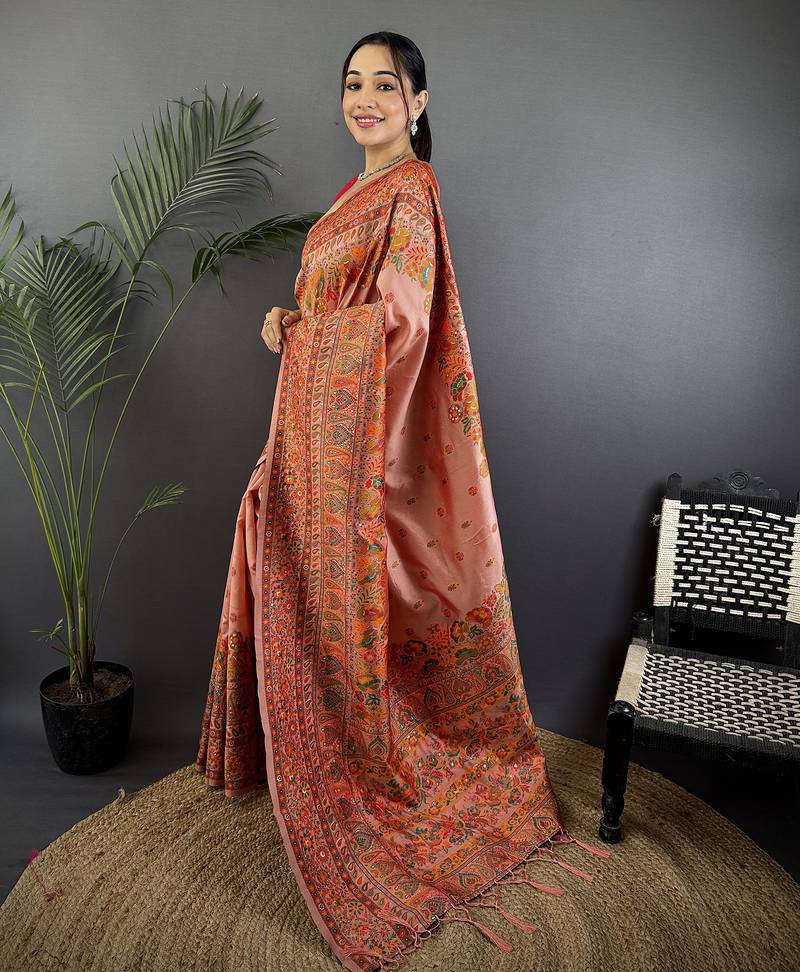 Peach pashmina silk floral&paisley motifs madhubani design kashmiri saree
