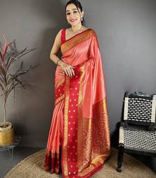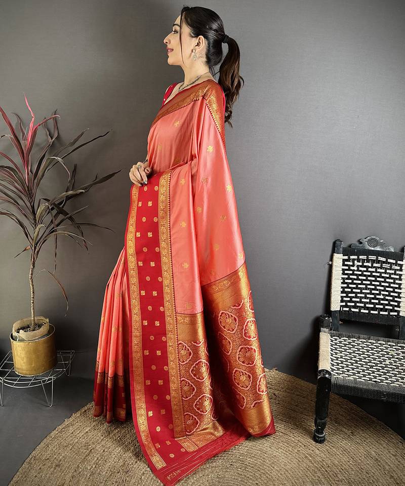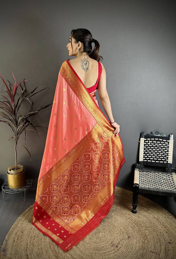 Peach soft silk small floral zari butti gold zari weaving banarasi saree