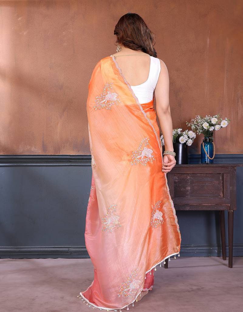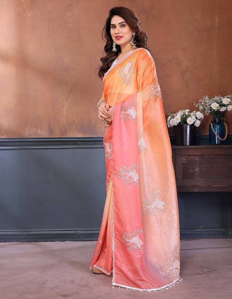 Pink & orange gold crush multicolored floral motifs embroidery saree