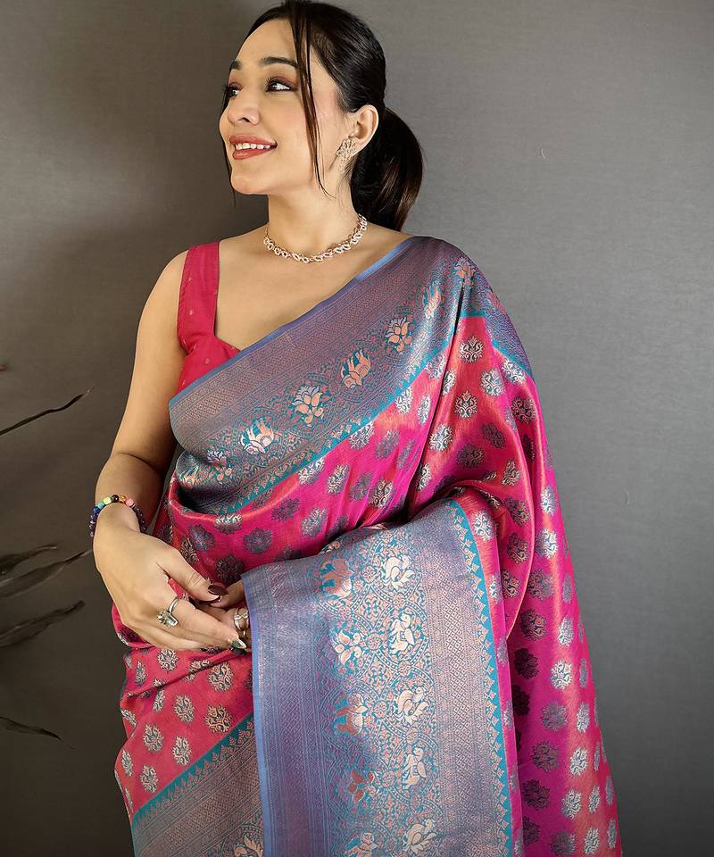 | Product Description | Pink Tissue Silk Saree Offers A Soft And Fresh Look With A Light, Smooth Feel. The Fabric Drapes With Ease And Stays Comfortable For Long Hours, Making It A Good Choice For Festive Days And Family Functions. This Saree Has A Simple Floral Pattern With Copper Motifs That Add A Gentle Shine. The Design Looks Neat And Balanced, Making It Suitable For Both Day Events And Evening Wear Without Looking Heavy. Style It With Simple Jewelry For A Clean And Easy Look. The Tissue Silk Fabric Is Light And Easy To Manage And Keeps Its Shape Over Time. The Pink Shade Stays In Trend, Making It A Smart Wardrobe Choice. |