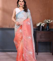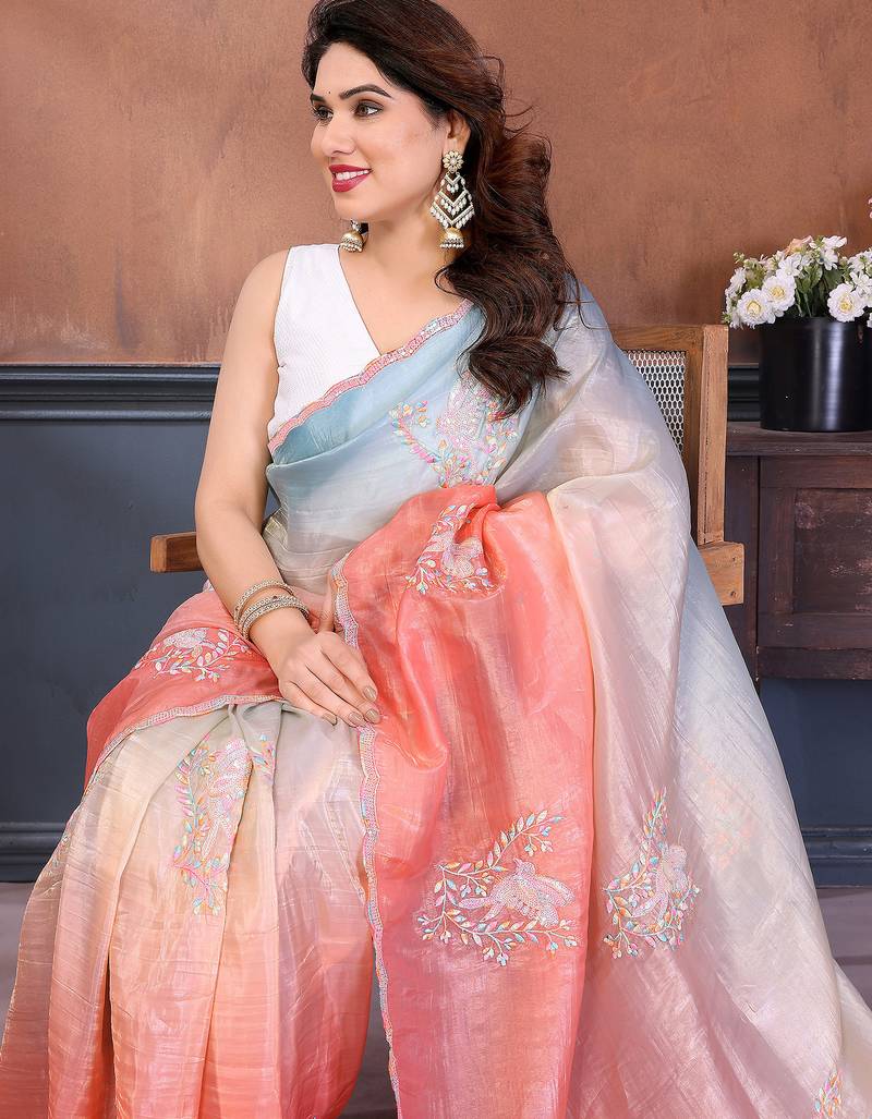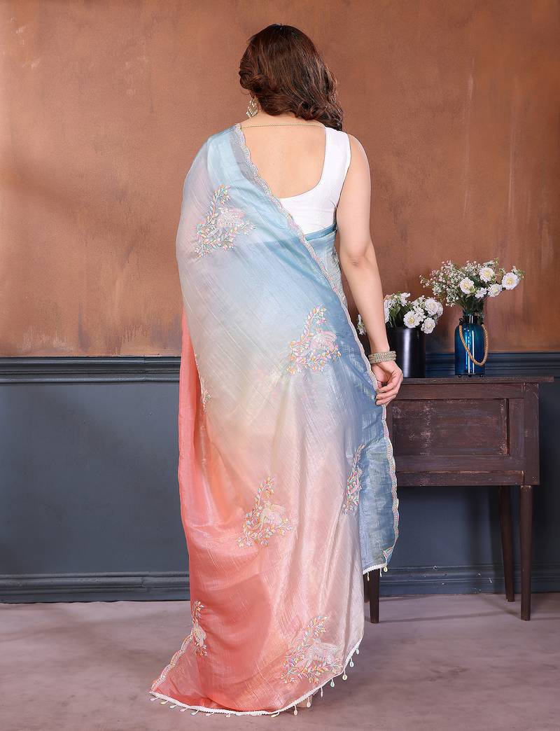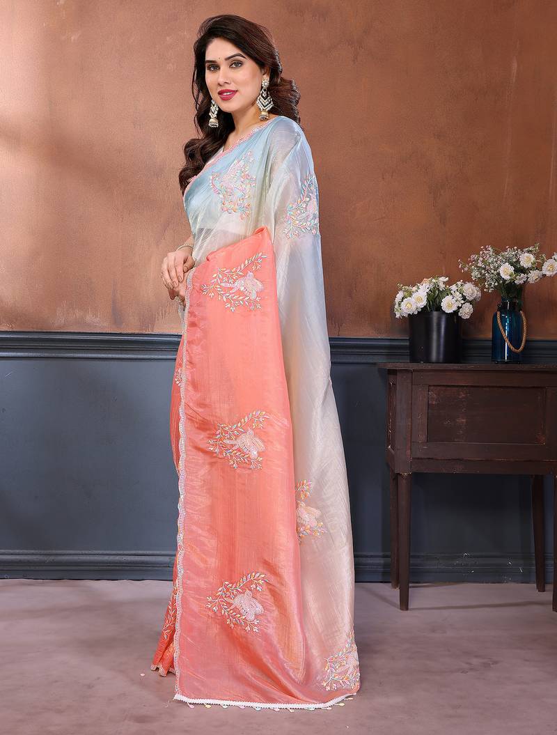 Rama & peach gold crush multicolored floral motifs embroidery saree