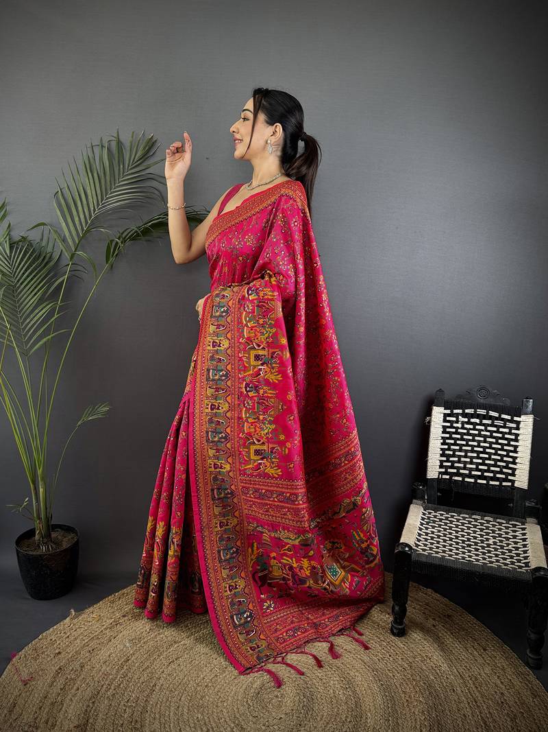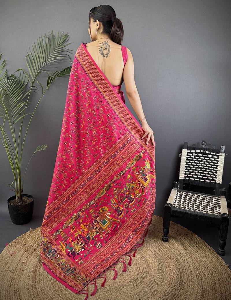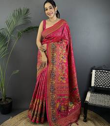 Rani pink pashmina silk meenakari weaving madhubani design kashmiri saree