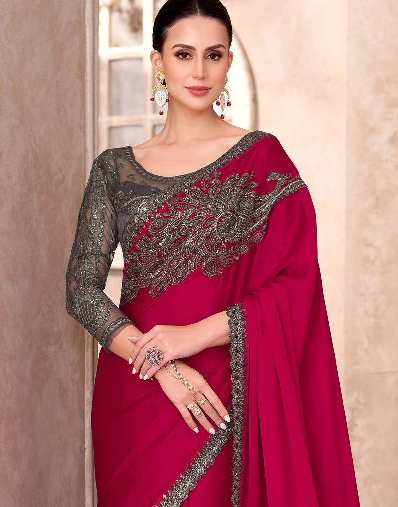 Red chiffon silk heavy embroidery and sequin work partywear saree