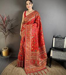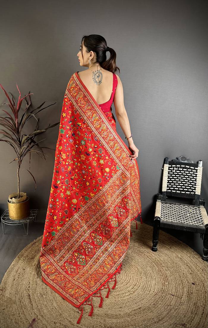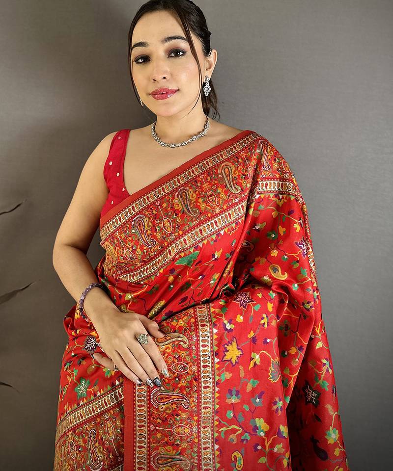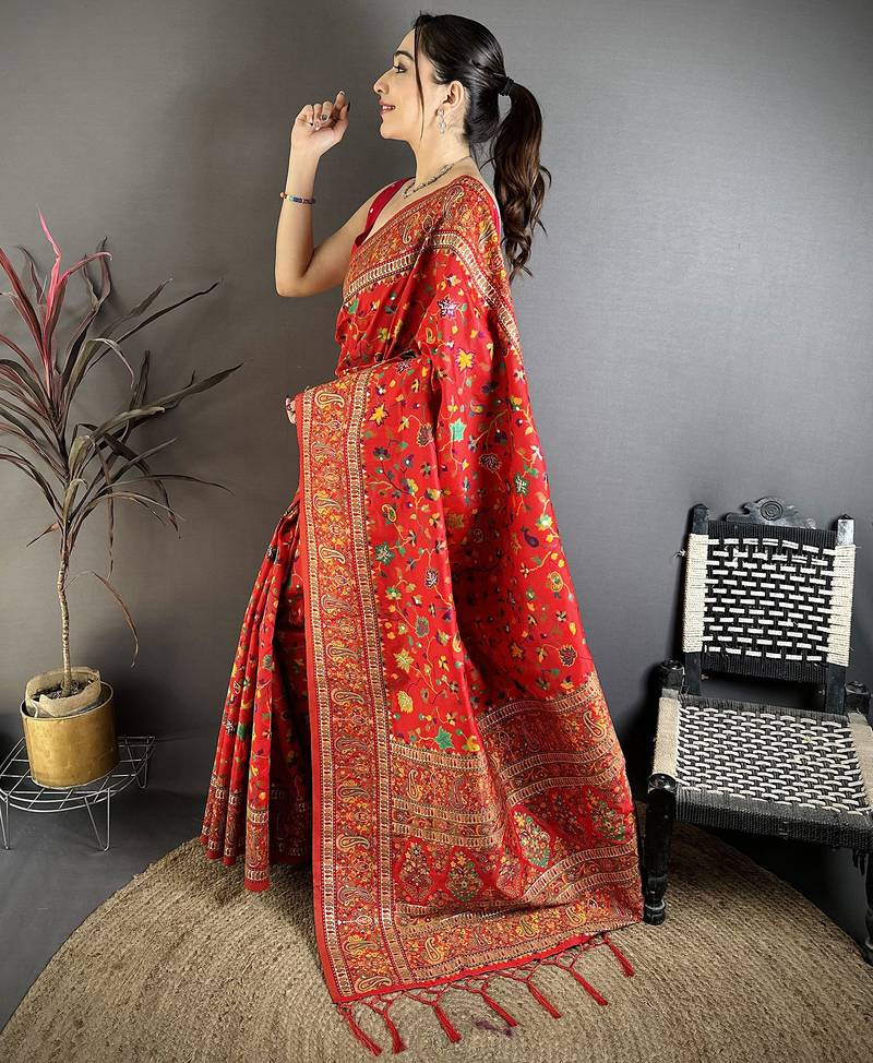 Red pashmina silk meenakari weaving madhubani design kashmiri saree