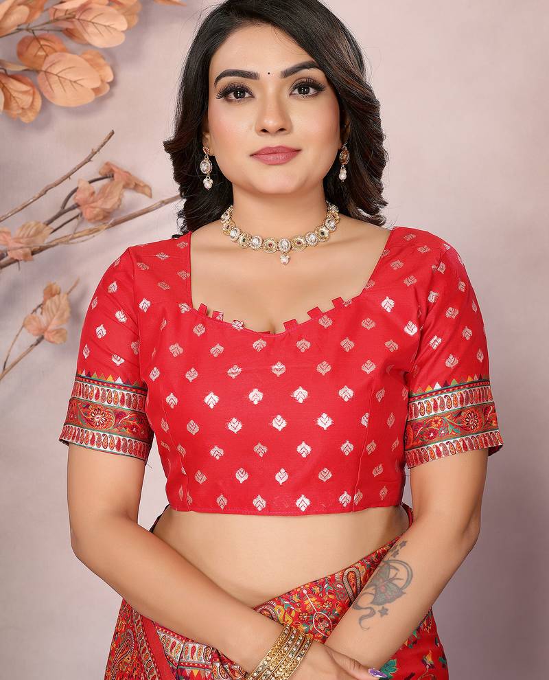| Product Description | Red Pashmina Silk Meenakari Weaving Madhubani Design Kashmiri Saree Offers Soft Touch And Light Feel. It Is Made For Daily Wear And Small Events. The Red Shade Gives A Simple And Rich Traditional Look That Suits All Age Groups. It Has Neat Meenakari Weaving With Madhubani Style Patterns. The Design Is Smooth And Easy To Drape. It Stays Comfortable For Long Hours And Is Suitable For Family Functions, Cultural Events, And Regular Ethnic Use. Pashmina Silk Fabric Is Soft, Breathable, And Skin Friendly. This Red Kashmiri Saree Works Well In All Seasons. It Gives A Simple Ethnic Style For Everyday Use And Light Festive Occasions Without Heavy Or Flashy Look. |