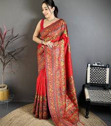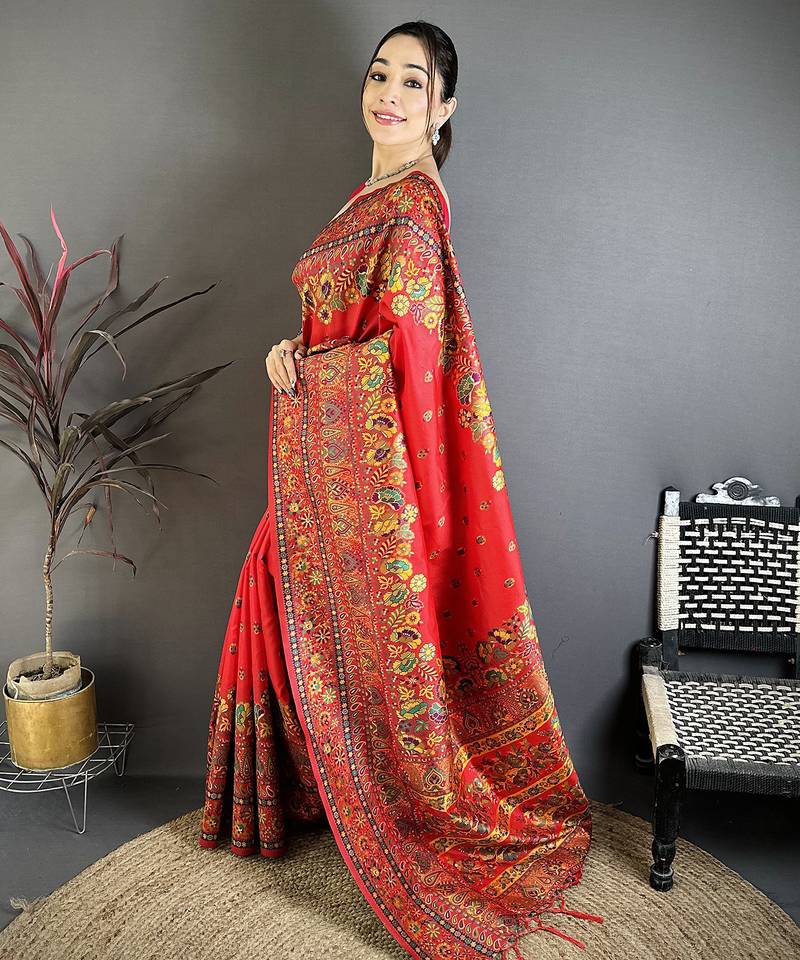Red pashmina silk meenakari weaving madhubani design kashmiri saree
