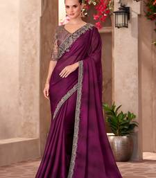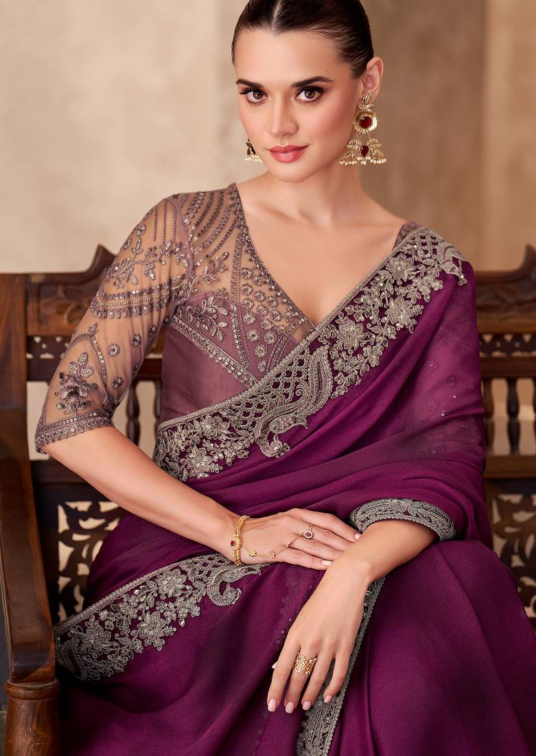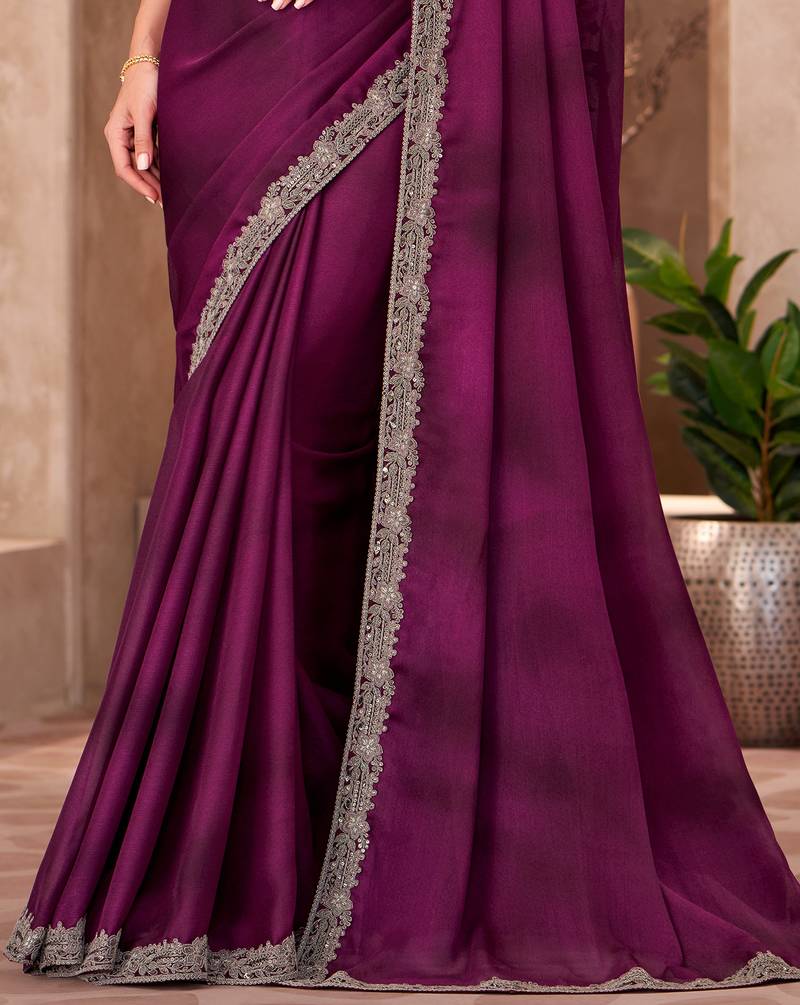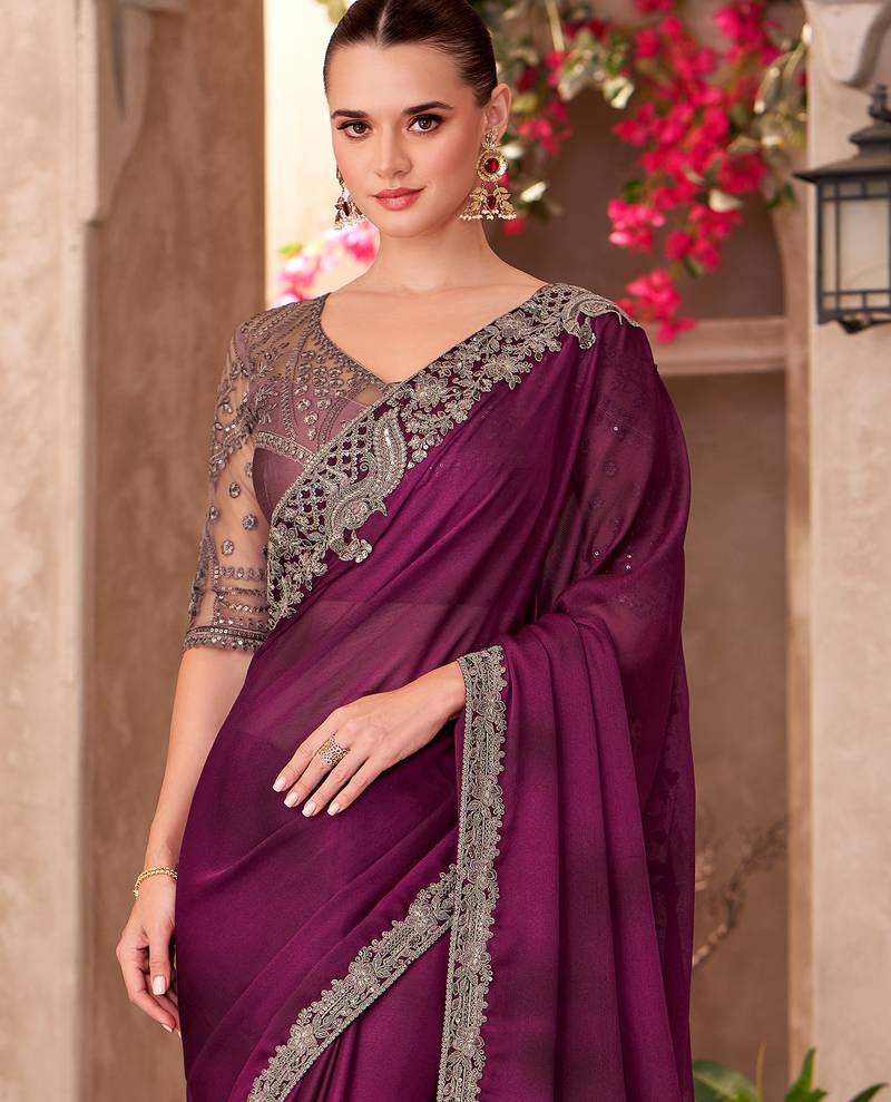 Wine satin chiffon heavy embroidery and sequin work partywear saree
