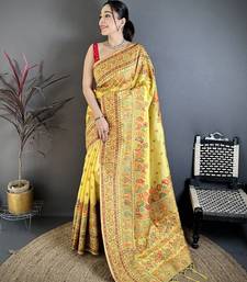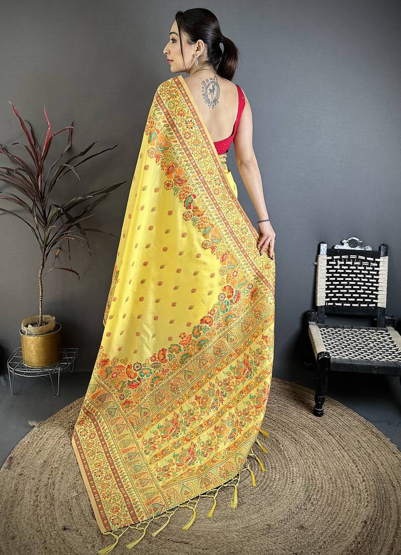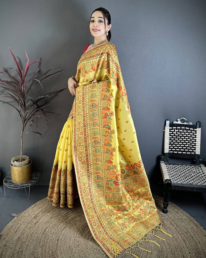 Yellow pashmina silk meenakari weaving madhubani design kashmiri saree