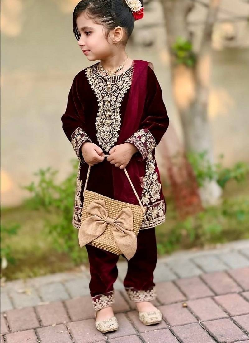 Designer viscose velvet embroidered work kids kurta set