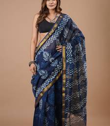 Blue maheshwari silk saree with woven borders and beautiful hand block print