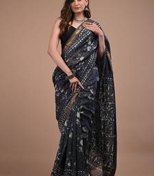 Dark grey maheshwari silk saree with woven borders and beautiful hand block print