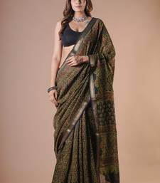 Green maheshwari silk saree with woven borders and beautiful hand block print