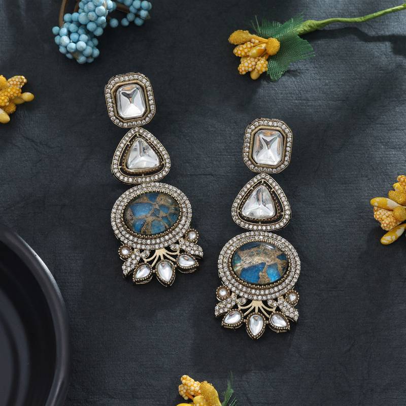 | Product Description | Earring Length: 7.60 Cm X Width: 2.60 Cm | Metal: Brass With Good Quality Apala Polish // Mehandi Gold Plated | Color: Firozi | Stone: American Diamond & Monalisa Stone | Gross Weight: 39.00 Grams | Package Content: 1 Pair Of Earrings | Back Finding: Post With Friction Back X Earring Style: Dangle |
