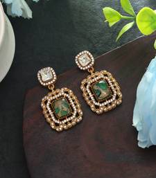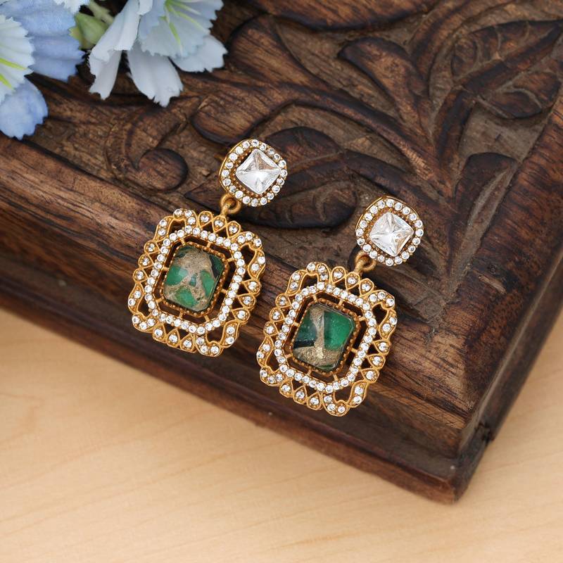 | Product Description | Earring Length: 3.60 Cm X Width: 2.00 Cm | Metal: Brass With Good Quality Gold Plated | Color: Green | Stone: American Diamond & Monalisa Stone | Gross Weight: 18.00 Grams | Package Content: 1 Pair Of Earrings | Back Finding: Post With Friction Back X Earring Style: Dangle |