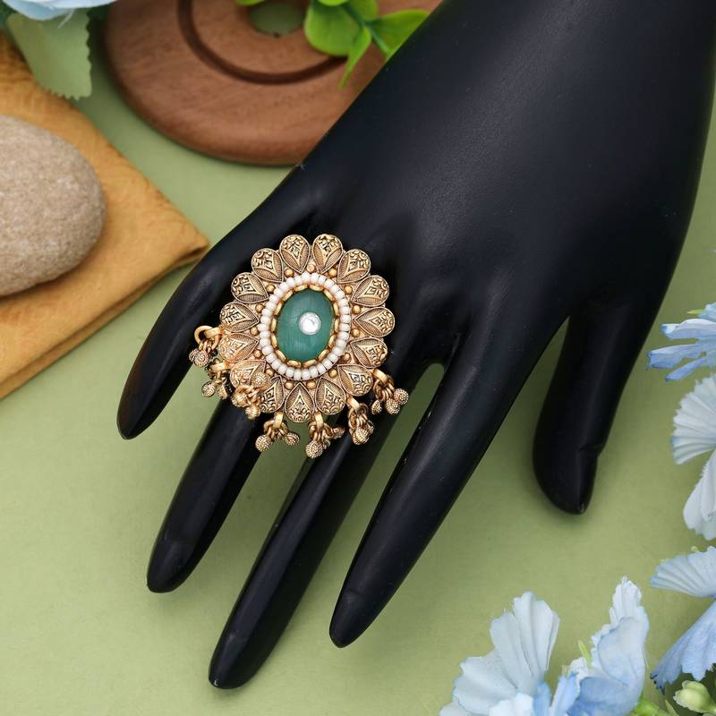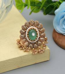 | Product Description | Ring Size: Adjustable | Diameter Length: 4.30 Cm X Width: 3.60 Cm | Metal: Alloy With Good Quality Gold Plated | Color: Pista Green | Stone: Glass Stone | Gross Weight: 15.00 Grams | Package Content: 1 Piece Of Ring |